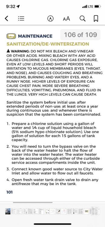 I use a bleach & water solution as described in the Ollie manual. I use this for sanitizing all of the Ollie fresh water system, my fresh water hoses, and my portable containers. I use the large AquaTainer portable container as the reservoir of the bleach & water solution for drawing it into the boondocking port during the sanitizing process. It’s worked well so far to prevent any problems.