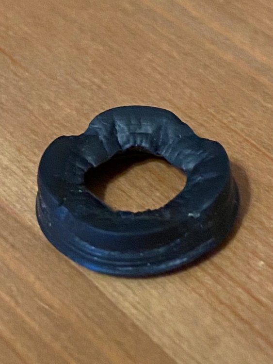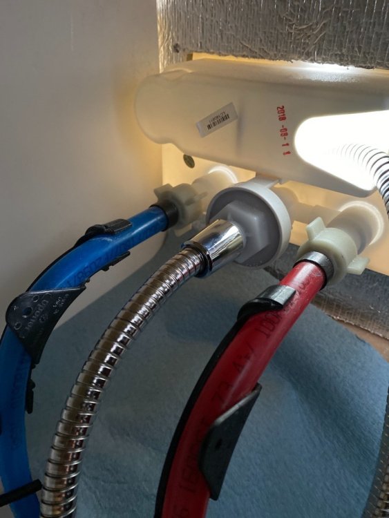 I was having an issue with reduced water flow at the outside shower head. Thinking it might be the usual mineral buildup or plastic shavings issue in the hose or shower head, I decided to disassemble things starting with the shower head and working upstream. No mineral buildup or plastic shavings found, but when I removed the flex hose from the valve assembly, I did discover that the rubber washer that seals the flex hose to the valve assembly was swollen to the point that it was almost completely restricting the flow of water from the anti-siphon check valve inside the valve assembly. I’ve only used the normal chemicals in the water system for cleaning, disinfection, and winterizing (vinegar, bleach, and RV anti-freeze). But the seal obviously didn’t like one or some combination of those chemicals. I replaced the seal with one from my plumbing parts stash and now the flow is back to normal. Just something else to check for anyone noticing reduced water flow. Just be careful when removing the flex hose. There are several small parts to the little check valve inside