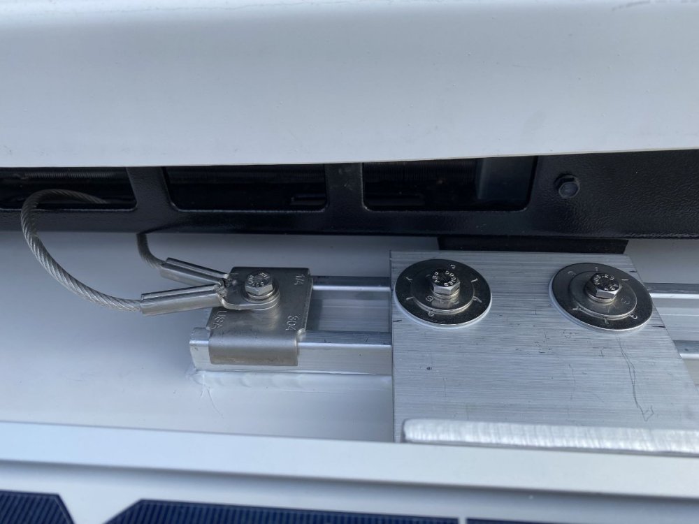 The LE only has 3 awning brackets. Using the front or middle bracket directly would cause interference between the existing panels and the new panel, so I used an offset from the middle bracket, plus the rear bracket. Awning off: Bracket alignment and attachment. Bottom 2 screws are flat-head so as not to interfere with awning attachment. Upper 2 hex head bolts are temporary until the awning is remounted through those holes. From memory, the awning brackets were something like 9 degrees from vertical, so the new solar brackets needed to be bent in order to be vertical where the solar panel attaches on the top. You can never have too many clamps and spacer blocks! Curbside brackets cut to proper height and mounted. Note the inboard aluminum strut channel is VHB taped to the roof... it had to be partially cut in 2 spots in order to be able to bend the flat, continuous base to follow the slight front-to-back curvature of the roof while still keeping the strut in one continuous piece (for maximum VHB tape contact area). Inboard brackets made from large aluminum angle, one rightside up and one upside down to follow the curve of the roof. Rear inboard angle bracket mounted "upside down" and at a slight angle to follow the roof curvature "Belt 'n suspenders" bracket at front of strut channel to help keep strut from lifting with wind load on the panel. Rear attachment to strut channel, with safety cable to help keep strut/panel from flying off the roof if VHB tape lets go. Top view of almost-completed installation Completed and in-service!