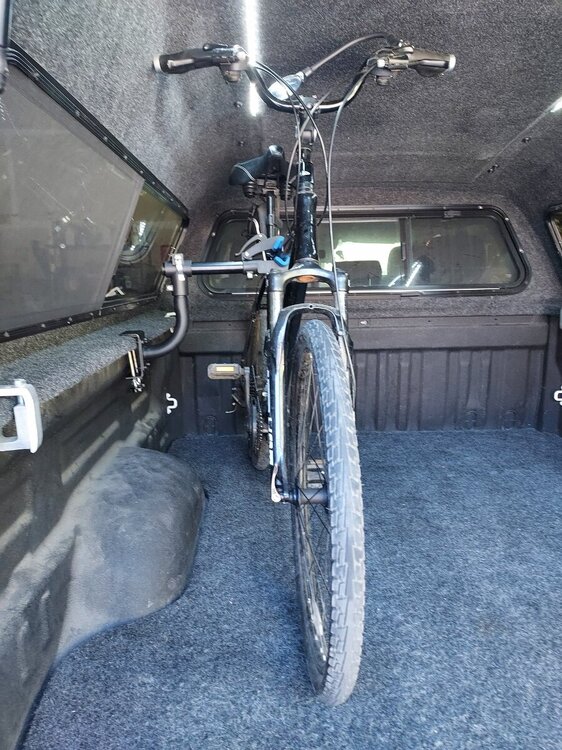 Thanks for your helpful suggestion. I have considered the Ride88 system. I actually purchased a different product from Amazon that secures the bike to the truck bed sidewall rather than that front of the bed: https://www.amazon.com/dp/B0FP4TT13F?ref=ppx_yo2ov_dt_b_fed_asin_title See attached photo. But, carrying my large mountain bike in the truck bed significantly limits the amount of other stuff we can haul in the bed. Our hope is to be able to carry the bike in a bike rack behind the trailer while on the road. Then, when necessary, secure the bike at night inside the truck bed with canopy. We can remove other stuff carried in tubs, that is a less likely theft target than the bike, and secure the bike inside the truck bed with canopy at night. Ronbrink, thanks for suggesting the front hitch mount. We may go that direction if we can't make the rear bike rack work. But, I am still hoping to find an RV-rated bike rack that will work with a 1.25" receiver. It seems to be that a 1-bike rack, properly designed, should not exceed the safe rear bumper load of an Oliver Elite II, and so be compatible with a 1.25" receiver. But, I have yet to find it! -