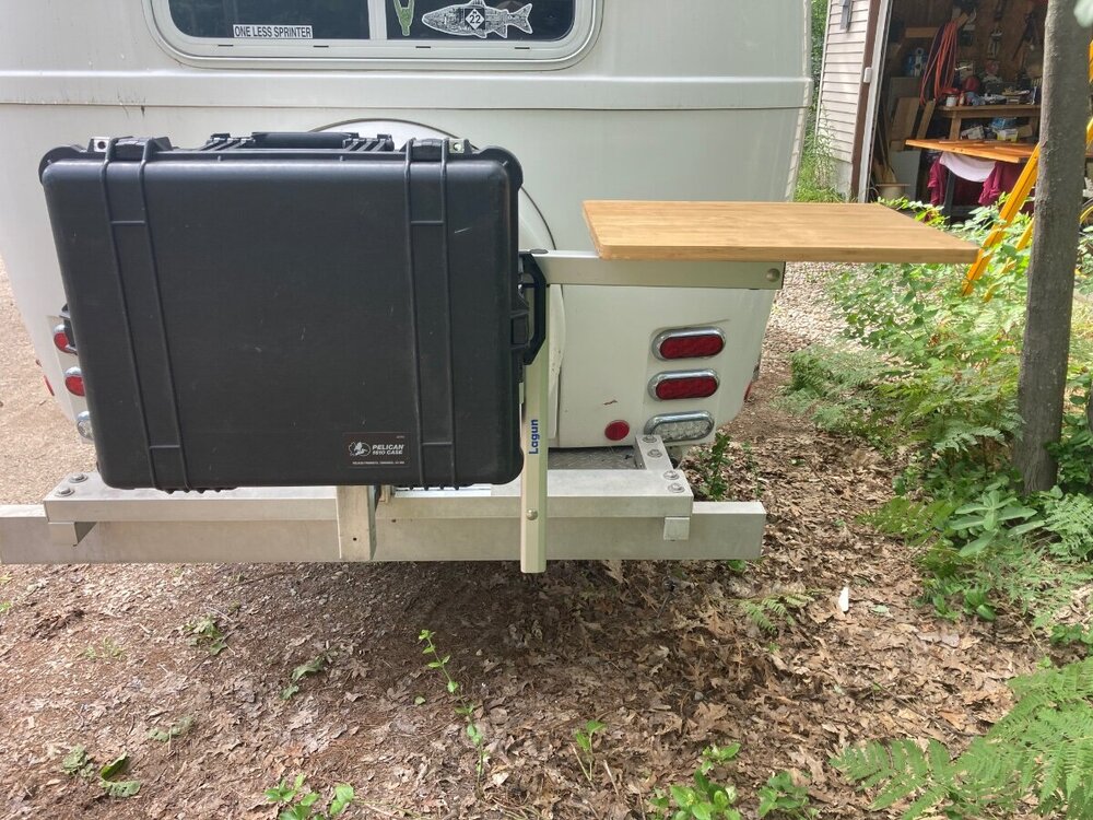 V.2 Updated outdoor Hitchen to house my camp stove and propane hose as well as attach a Lagun table. Like several of us, I prefer to cook outside and digging my camp stove and table out of the back of the truck can be a pain. Hoping this latest version will work well. The use of a Pelican case as a outdoor kitchen is popular in the overlanding community and should be easier to setup and stow than pulling cooking gear from the back of the truck. A pair of cables will be installed on the lid of the case so it rests parallel to the ground and can act as a surface upon which the stove can sit while cooking. Last image is the from a overlanding site. For those wondering why I don’t use the rear receiver to haul bikes, well I did this in the past but found that with a dog I would rather be on foot with her than on wheels without her. I also prefer not to cook inside the trailer as I detest cleanup of cooking residue (yes, I am lazy).