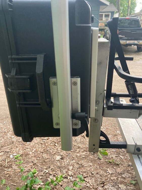 Table and swingarm get stored in truck. Upright mounting plate is bolted to pelican case so it can be adjusted up and down.