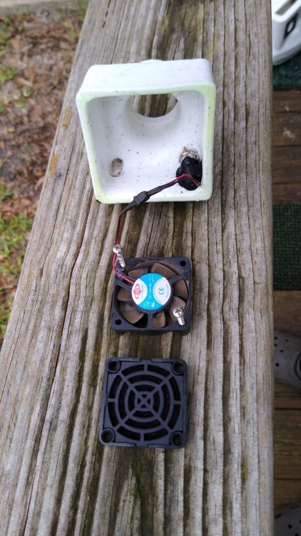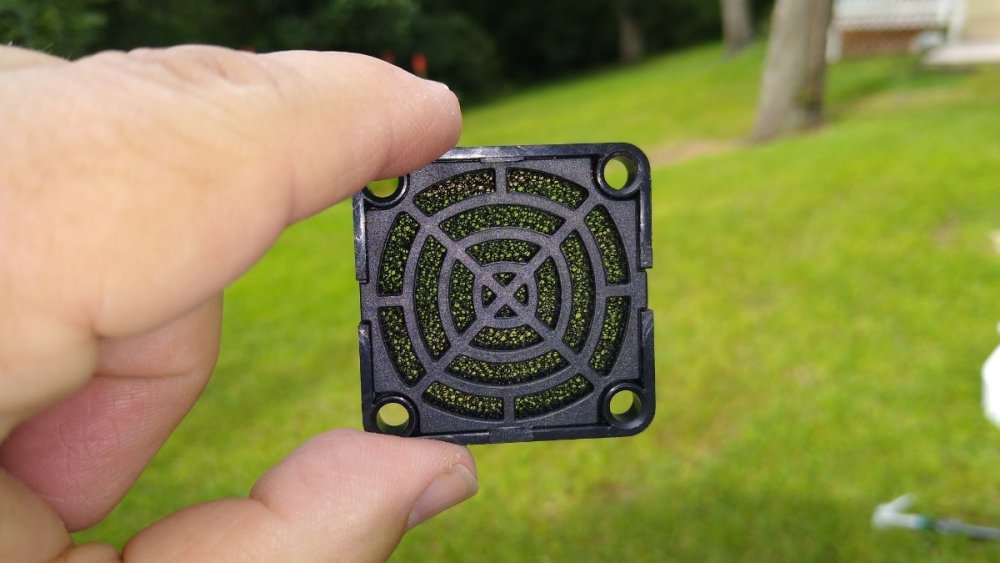 19. Most of the time our Natures Head has worked well. When the weather was very humid for days and the inside of the trailer was dank, the solids were not drying well. I purchased a dehumidifier and that seems to have helped. We run the dehumidifier as much as possible in the bathroom when the humidity goes above 80%. We also turn the crank more often during the day to help expose any moist areas. The issue may have been compounded by too much coir dust on the fan filter. When I took the fan assembly apart the filter was about 75% clogged. Perhaps the coir was not moist enough and the dust was pulled through by the fan when turning the crank or when I added extra through the top. If adding more from the top I now make sure to unplug the fan, mix, then wait for any dust to settle before plugging in the fan. I'm also leaning toward using sphagnum or coffee grounds to reduce the dust. Here are some photos of the fan assembly. No fuse here. I forgot to take a photo of the dirty filter before cleaning it, but one shows the dust on the fan. I'm tempted to add one of these fans to the spare parts kit. Cleaned filter Hope you get it figured out soon. Dirty fan Whole assembly