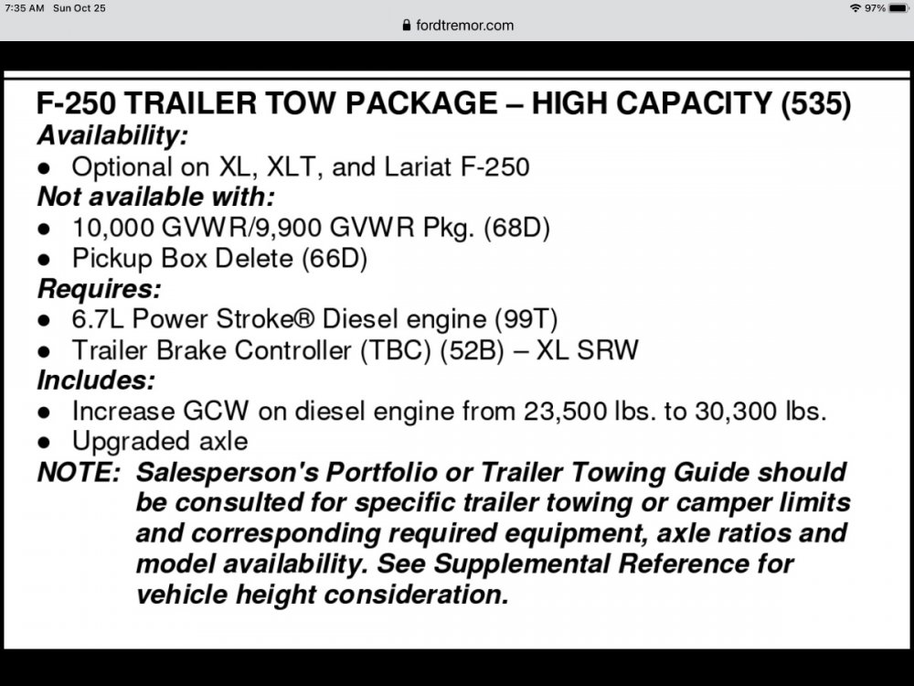 Thanks! It’s my understanding that a Yakima roof rack can be installed. I am not sure about the weight limit, I did not inquire as I really have no use for a roof rack. If we can’t carry our gear inside the cab and under our topper out of the weather - we likely have too much stuff. We have the high capacity tow 535 pkg and zero issues with trailer sway when traveling on the interstate or windy conditions. As for the Tremor suspension/ride? We just rolled over 2k on the ODO and we are very pleased with overall super quiet interior & comfort level when empty as well as towing. Much more comfortable and needless to say powerful than our former half ton TV. The Ollie towing mileage was impressive @ 17.9 - 18 mpgs on our last week long trip. This was only the computer feedback. At some point I will do the math and compare. The topper added approx 200# of weight to the bed which is nothing. I read and heard the the F250 & F350 Tremor supposedly have the same identical suspension. I have yet to confirm this as fact. However with the 535 pkg listed below it may be accurate.