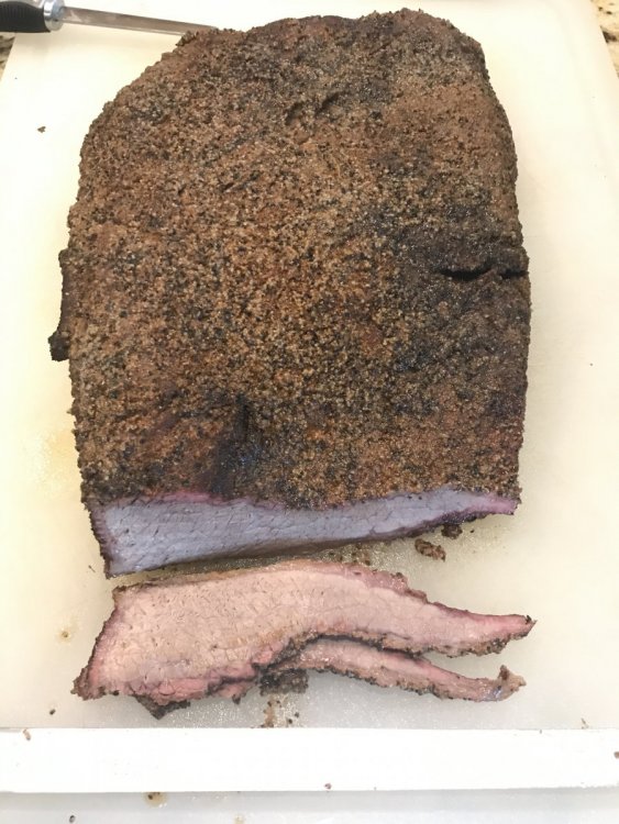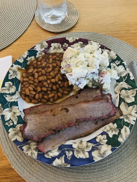 Thank you for the nice compliments! Just a work in progress. A few pics of of the finished brisket....Kathy made homemade warm potato salad and baked beans with a little local mule kick chipotle bbcue sauce. We don’t eat this way every day...but I gotta say we are pleased with how tender it turned out. I even managed to get a nice little smoke ring going on. We do like brisket with breakfast. No room for blueberry cobbler...huh? it should be illegal to say that...😄 Gotta have a little bark.