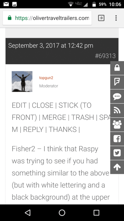 If you are logged in, you should see something like this above each post. If you are not logged in, your black stripes above post will look like this If you are logged in, and only see a black stripes like the second photo, something is wrong with your account permissions. Contact one of the mods, and we will help you fix it. We want you to be able to enjoy the whole forum experience. Sherry