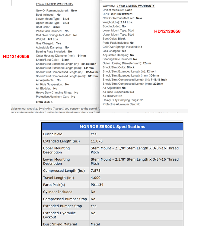Hello Steve Contrary to your post above, everything I've read indicates the part number for Bulldog replacements of the Monroe 555001 is HD1213-0656, not HD1214-0656. I put the specs for each as well as the Monroe OEM 555001 in the image below. The specs on the left are for the HD1214-0656 and the right frame is the 1213. If you compare it with the OEM Monroes (the bottom frame), the 1213 shocks line up much more closely than the 1214. My question is: is this just a simple mistake or is there a reason you were recommending the Bulldog HD1214-0656? I ask because I am about to change mine out on my 2018 LE2 (#344) and want a robust replacement. -