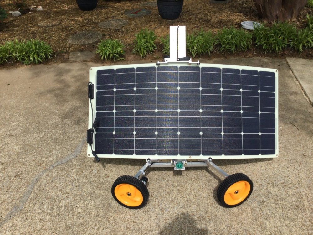 SOLAR ROVER - Photos/video below IMG-8491.MOV IMG-8491.MOV The Rover (patent pending) is a unique lightweight portable inexpensive ve of Happy Camper Solar’s initial Solar Tracker (patent pending). Both the Solar Tracker, (rooftop mounted) and Solar Rover (ground mounted only) will be debuted at the 2021 Oliver NOT Rally at Lake Guntersville State Park, Guntersville, AL. The rally occurs May 13-16. However, the Solar Tracker and the Solar Rover will be on display for only one day during the rally. The Solar Rover is: ENERGY EFFICIENT- The Solar Rover works like the Rooftop mounted Solar Tracker. It will move both vertically and horizontally all day from sunup until sundown by AUTOMATICALLY tracking the sun, picking up the solar panel and pointing the panels directly at the sun all day. Using this system, your panels gain maximum exposure to the sun all day long. No more adjusting panels, tilting them or crawling up a ladder. The wheels are angled to move the Solar Rover in a tight semi-circle. The Solar Rover is ground based use only. GREATER USAGE. I have camped in campgrounds, especially state and national parks that have little or no hookups but nice shade trees. The park ranger insists on parking on the pad that is in the shade, NO SUN!! . You simply take 2-3 minutes to set up your Rover on the ground and in the Sun, attach the leads to your battery and begin charging. HIGH TECH- The Solar Rover, much like the Solar Tracker, has a lot of advanced technology built in. With a GPS, computer database and other instrumentation, it will sense the direction of the sun and adjust the position of the Solar Rover AUTOMATICALLY, both horizontally and vertically continuously until sundown. PORTABLE. It weighs barely 9 pounds, folds up for storage and set up time is about 3 minutes. Using a semi flexible solar panel (100 watt in photo) will make the entire unit more lightweight and easier to store. ACCOMMODATES DIFFERENT SIZED PANELS. The Solar Rover is adaptable to utilize various lengths and widths up to a 150-watt panel. There are adjustable clamps horizontally and vertically that are easily adjusted for various sizes. Larger sized panels make this unit unstable in a heavy wind. Development of another Solar Rover is underway to accommodate even larger panels. SECURITY- the Solar Rover can accommodate a lock to safely secure it to your trailer. It can be staked to secure it from high winds to keep it from blowing away. BATTERY MAINTENANCE. The Solar Rover can be used to maintain your batteries when your unit is in storage, if in the sun and the cord length is not excessive. This is not a replacement of the Solar Tracker, rather it is designed to augment the rooftop mounted solar configuration. It can be operated jointly and easily with the Solar Tracker at the same time. There are many additional features of both units. Please feel free to post questions. I or one of my engineer partners will answer you. Coy E. Gayle