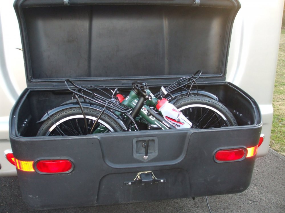 I may have to rethink the above Trunk idea! The above picture shows our old Folding Bikes, not ebikes attached to the back of our old Motor Home. It wasn't a problem lifting these into the Trunk because they are much lighter. My intent was to put only one ebike in the Trunk, about 55 lbs without the battery, over twice a regular Folding Bike. I am 72 years old and could probably lift the ebike, but sooner or later it would probably hurt myself. My ebike is expected to arrive in one week, so I better get in shape.