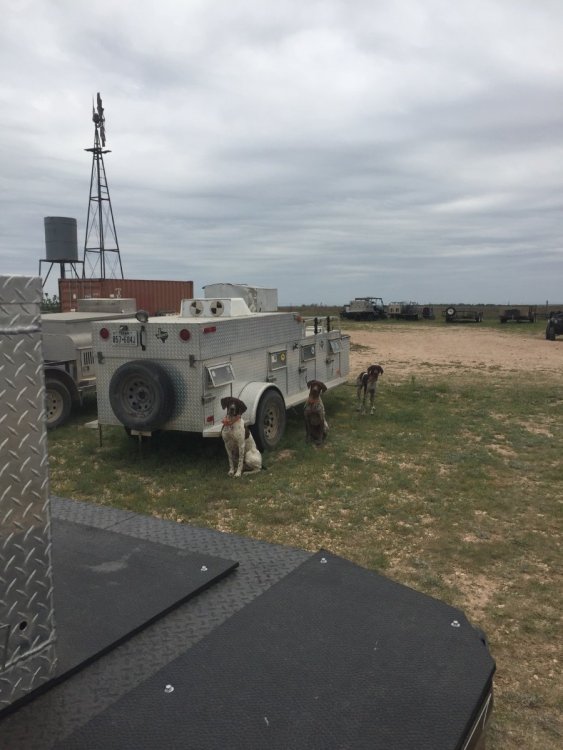 The dog in photo is a German shorthair. His name is Grits. We have 4 that compete. I had a custom insulated dog box built for my pickup flatbed. They each have a box. The pickup is a Duramax. I planned for a tow behind camper so we could stay on the fields instead of going to motels each night. Been planning for this for a long time as I approach retirement. I cannot wait to get my trailer!