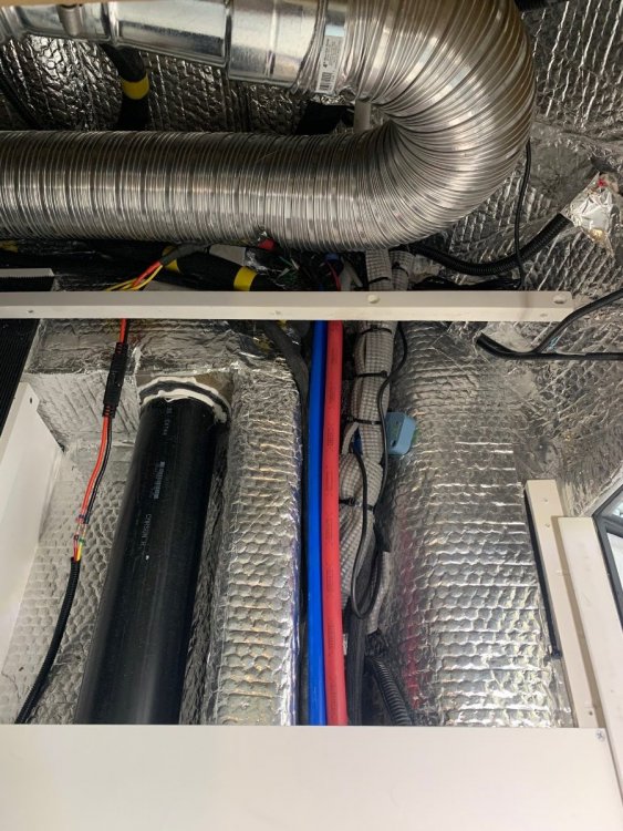 Here are some pictures of the various things we've been sharing ideas on in this post... First, a boring picture of the 6" vent I put in for the "bilge fan" under the front dinette seat. Again, I wanted a way to move conditioned cabin air throughout the basement (hot or cold) that was independent of the furnace fan - which cannot be run without heat anyhow. And the fan itself. You have permission to laugh at the bungee cord installation. It's temporary for now until I find a good way to mount it permanently. Ugly but it is working! 😉 Here's the remote controller for the smart fan. I "hid" it behind the blind sort of. It's not pretty either but it has a temperature sensor and all kinds of ways to program the fan for various situations. Also, no drilling or screws unless absolutely necessary - and it isn't necessary for this as I used 3M two sided tape and just ran the sensor wires through the hatch. Now onto the other part of the "all electric" backup heat solutions... Here's the heat cable tie wrapped to the backflow check valves. Tough to see, but the cable is 4' long so runs 2' on each line - with the cable touching each backflow check valve. This is similar to putting a pump or two of antifreeze into each port when winterizing (I hope). You can see the wires leading to the cable running in the "tray" along the black/gray drain pipe on the left (1st pic above). In the next pic, here's the connection I made to the 12V fuse box (annotated by the arrows) and the negative bus bar (yellow lines). I used lucky terminal number 13 on the fuse box and had to share a connection on the negative bus bar (I know, not a good practice, but OTT already had done it once so what does doing it twice hurt?). I'll put a switch in someday (maybe) - for now it's just put the fuse in if you want the heat cable on, take the fuse out if you want it off. Side note: That thing wrapped in the yoga mat is the end of my HVAC line that runs on the street side. If you look closely, you can see 2 red automotive vacuum hoses coming out of the end and going under the dinette floor. This is how I'm getting some heated air to the front street side from the furnace. I'll share this picture below mainly so you can all laugh at the hole I created in my ductwork below the battery box (I used a screwdriver - LOL). Nowhere near as "sexy" as @Minnesota Oli's beautiful drilled hole! Paul, I may have to put in an order for that part so I can upgrade my solution someday! 🙂 The wire for the heat cable is running right underneath the hvac line in the picture. Last but not least, I put some insulation around the cable, pipes and valves before replacing the floor to help keep the heat where it is supposed to be. You can also see my temp/humidity sensorpush tucked beside the line as well as the temperature probe from the smart fan tucked into and up against the check valve itself (for now I want a really accurate reading of the pipe temp). You are all welcome to laugh again - see the hole in the ductwork right above? Yep, my screwdriver got busy there too in order to direct some heat at the valves and plumbing in that area. 🙂 Heat cable test - not super cold out, but it is working for sure. Turned on the heat cable at 4:30 AM this morning. -