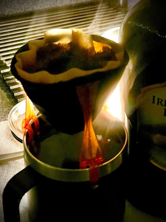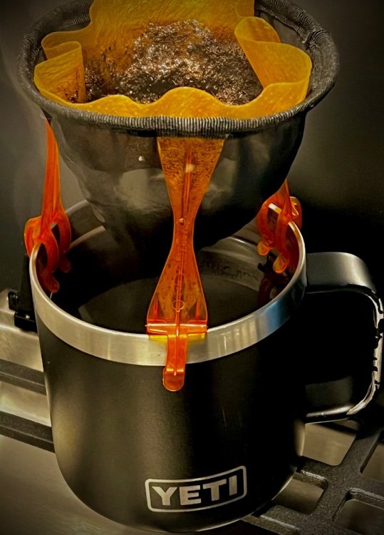 Old backpacking habits die hard, as space/size/ weight still matters, as much as great coffee matters. This GSI pour over filter has been in use for well over a decade, along with the pot I use to boil water, having survived countless backpacking adventures , and now lives in hull 997. I use a paper filter, so little water is wasted on clean up. It folds flat, takes a beating, dries fast, weighs nothing, brews a great cup, too.