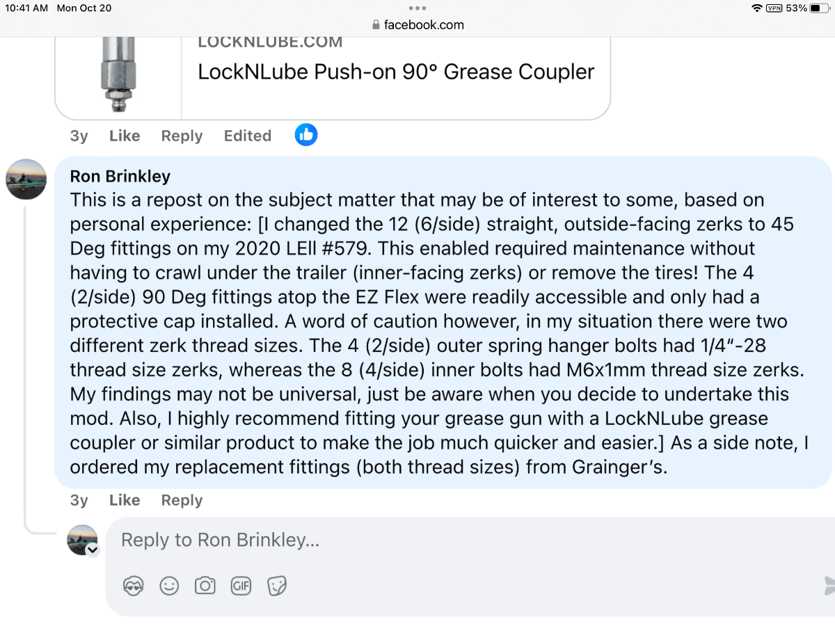 The front and rear leaf spring hanger wet bolts were Metric and a few of the center hanger bolts, as well; random and one off for sure. I did not replace the stock EZ Flex zerks, being 45° fittings already, so really can’t say what thread size they are. -