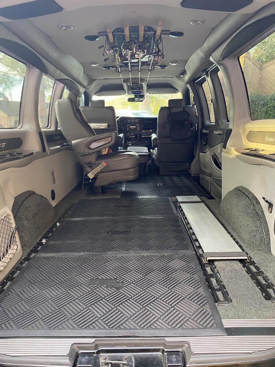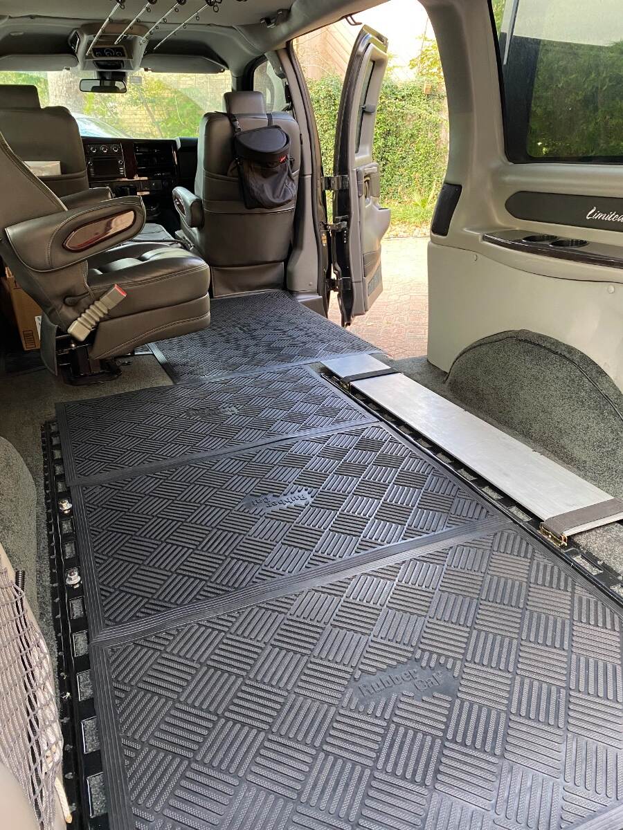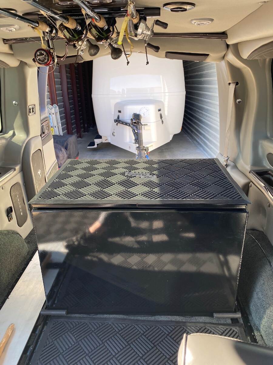 For the first time since incorporating the two cargo boxes in the Savana 15 months ago, I had reason to clear the cargo bay yesterday to haul a 75” QLED TV. I generally keep one box in the van as a trunk, while the other is stowed at the Cow Barn full of camping gear in readiness. For perspective, distances from the rear doors to the rear passenger seat is 6’ and to the back of the two front seats is 10’. I snapped a couple of pics this morning of the new rubber mat layout and to illustrate the unhindered spacious area of the cargo bay. The second and third 24”x36” floor mats from the rear are positioned in the footprint of each box when carried and fit perfectly atop the boxes for added protection. The aluminum plate is a runway for our folding e-bikes followed by a few extra cargo strap attachment points to secure the Dometic fridge/freezer when camping or other miscellaneous cargo, as needed. EDIT: Went back to the Cow Barn to reload the ‘trunk’ cargo box and snapped a pic of it positioned with the rubber mat on top. Ignore my foot reflection as I lounged in the rear passenger captain’s chair enjoying a beer!