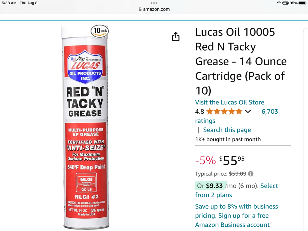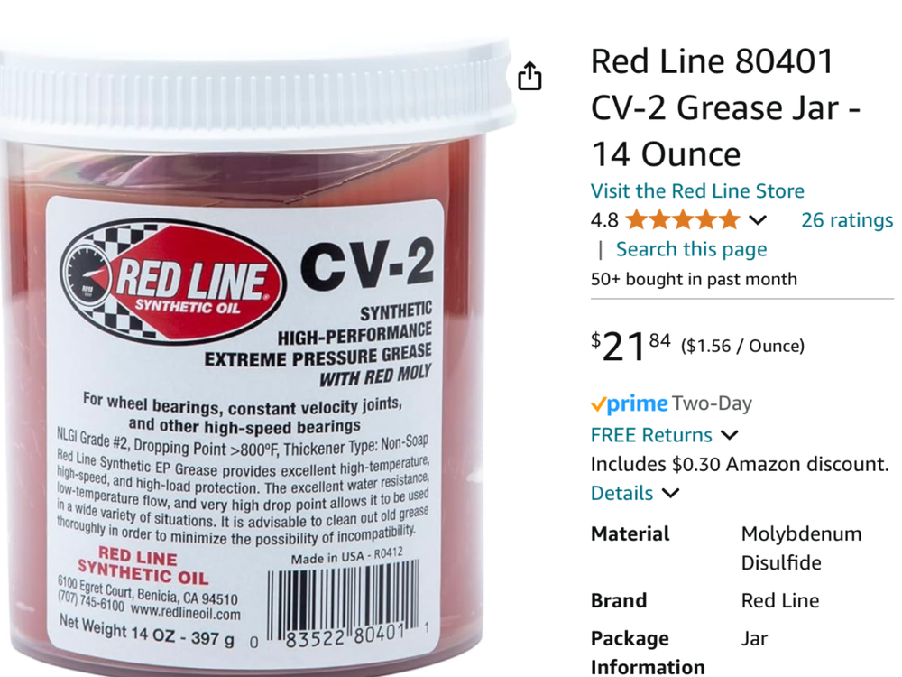 I use Red Line CV-2 grease in a jar for wheel bearings and Lucas Red ‘N’ Tacky grease for the suspension. Amazon purchases, free delivery. Note: A jar of the CV-2 will grease bearings on two axles and then some.