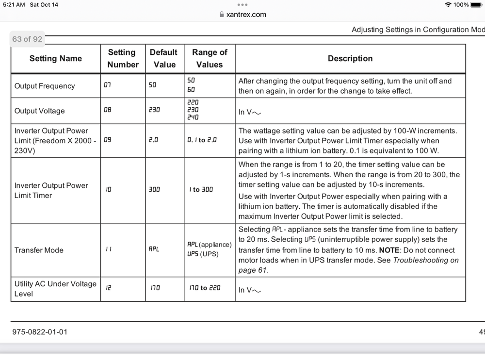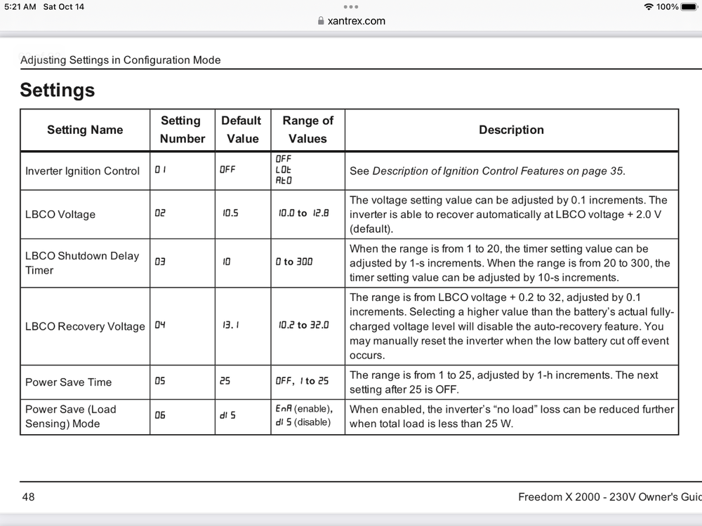 My Xantrex 2000 is not BT capable, but find using the remote panel easy to pan through the settings and make changes. I obtained the settings table from Oliver when converting to LFPs; only difference in my specific settings were #9 set to 2.0 (inverter is 2000W [2.0] rather than 3000W [3.0]) and #24 set to 80 (2000W inverter/80A charger rather than 3000W/150A charger).