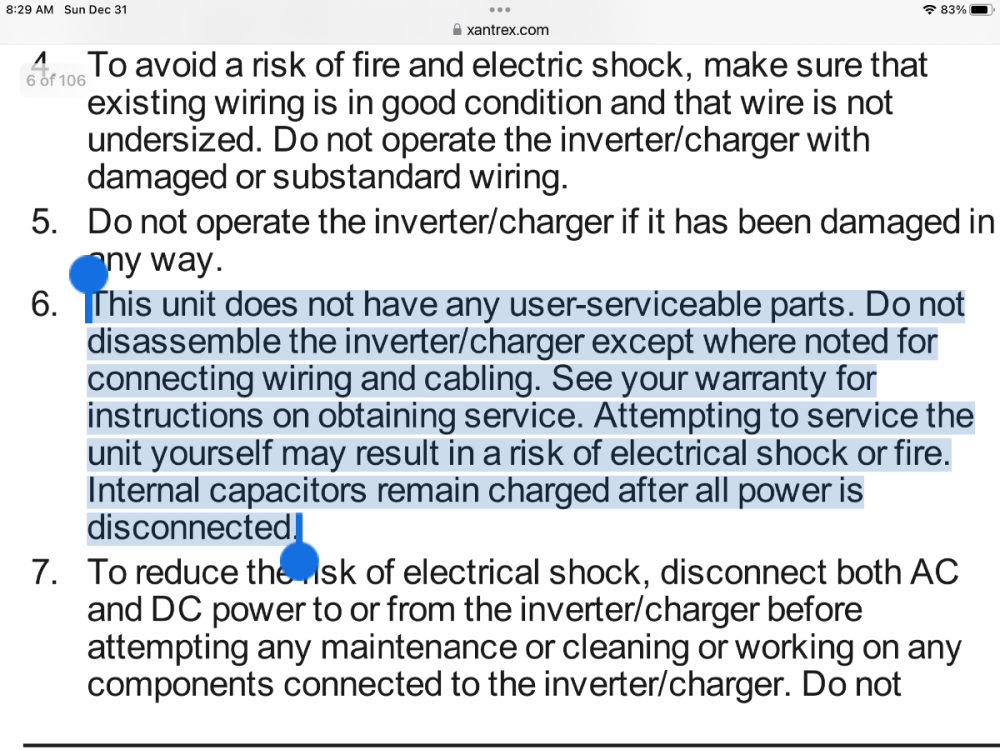 Thank you for your continued attention to this matter, much appreciated! In response to your questions: 1. Was the house battery negative disconnected or just the positive? You didn’t mention the B- cable. - - The negative cable was not disconnected, only the positive at the battery terminal. 2. I hate to do this, but I assume the tow vehicle was not connected, correct? - - That is correct, the Oliver was stowed at the storage facility and not connected to the TV. 3. Your forum signature states that you have a Renogy DC-DC installed, which I have no working knowledge of. Is it installed in the Oliver? Does it only work with the ignition on? Does it have the ability to store energy, maybe an internal capacitor? - - The DC-DC is installed within the rear dinette seat hatch. - - When the unit is plugged into the TV via a dedicated cable, it only receives power when the engine is running/alternator turning. - - Regarding an internal capacitor, a brief search indicates there is a very small electronic capacitor on the motherboard, this based on a teardown wherein a “JP” capacitor, 105C was referenced. The following statement by Renogy may or may not be useful information: The DC-DC battery charger isolates the input and output to prevent voltage transmission errors and interfere with house battery charging. 4. You might try turning off all 12v breakers and removing fuses. Verify the power is off with the Victron Smart Shunt app or a DC clamp on Amp meter. Then remove the main battery fuse as a different method of disconnecting the 12v supply from the battery. At least you would be inside if the fireworks started again. - - Good suggestions, my retired Navy-trained electronic specialist Son will be visiting New Year’s Day; I will certainly commandeer him to help troubleshoot! I will say that he has either assisted and/or advised me on all of my electrical upgrades to the Oliver, so I have a high level of confidence my current inherent issue(s) to be minor and easily remedied. Another bit of info; although the lead positive cable was disconnected to isolate the battery bank, a small positive jumper wire feeding the SmartShunt remained connected. However, my Son assured me that was not a potential power source contributing to the anomalies observed. Edit: Following the event, I gave thought that perhaps a capacitor in the Xantrex XC2000 inverter/charger could be the culprit, but holiday celebrations put the thought on hold until you jarred my memory. A quick search in the Xantrex Owner’s Guide and voila; under Product Safety Information, line 6: What think you?