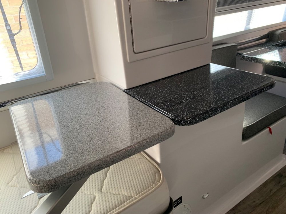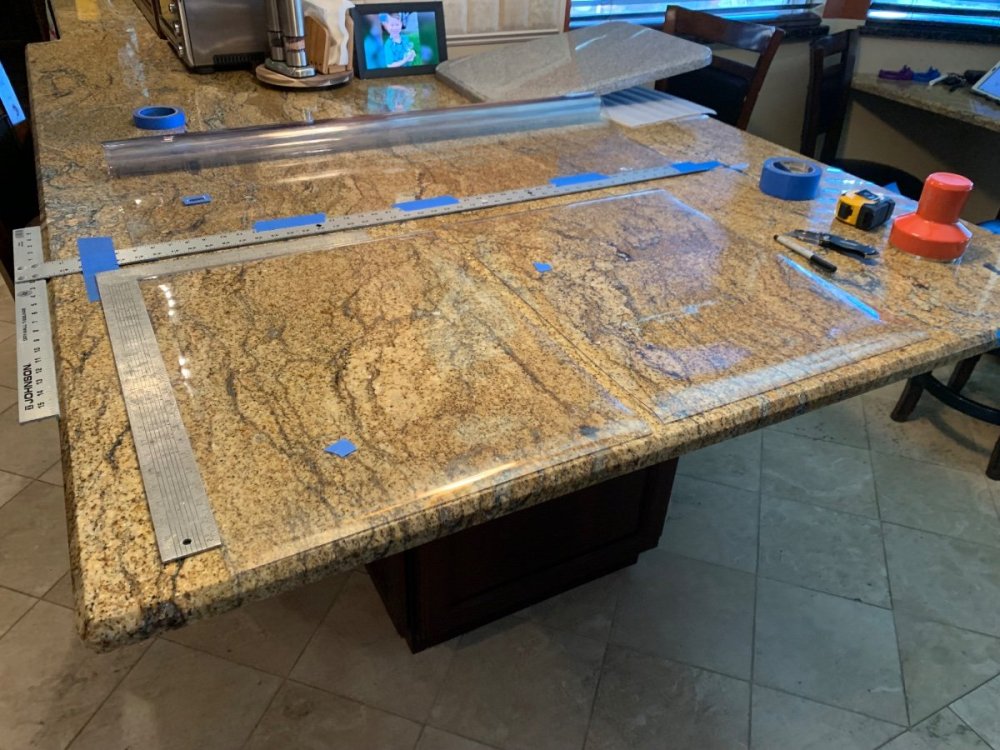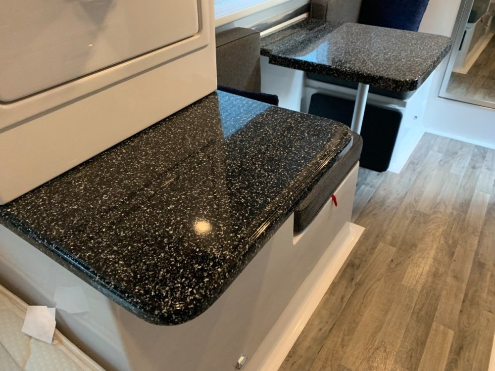 Just completed installation of table and counter top treatments. The material is a clear, 2mm thick, PVC protective cover generally used on home and office furniture; custom cut for all of the ‘flat surfaces’ in our Oliver. Now you see it, ….. now you don’t! Added protection for the pantry counter and Lagun tables that get a lot of use, as well. ‘The mess’, my wife’s words not mine! Sometimes you just gotta let a man do what he’s gonna do! Cutting corners. Best not to drink the margarita before doing this! The microwave counter and nightstand are also completed, but I need to purchase more material for the stove top/sink counter space. Say goodbye to the placemats and drink coasters!