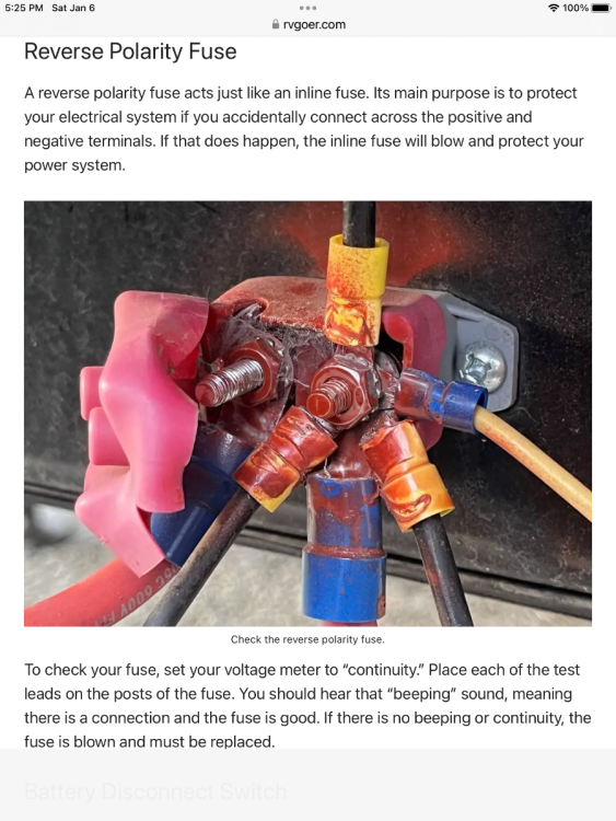 I don’t know about that, but my Oliver has a ‘reverse polarity fuse’ under the street side bed next to the 60A breaker for the DC buss bar. I purposely have the breaker tripped in this pic, the red rubber boot next to the breaker is said fuse. -
