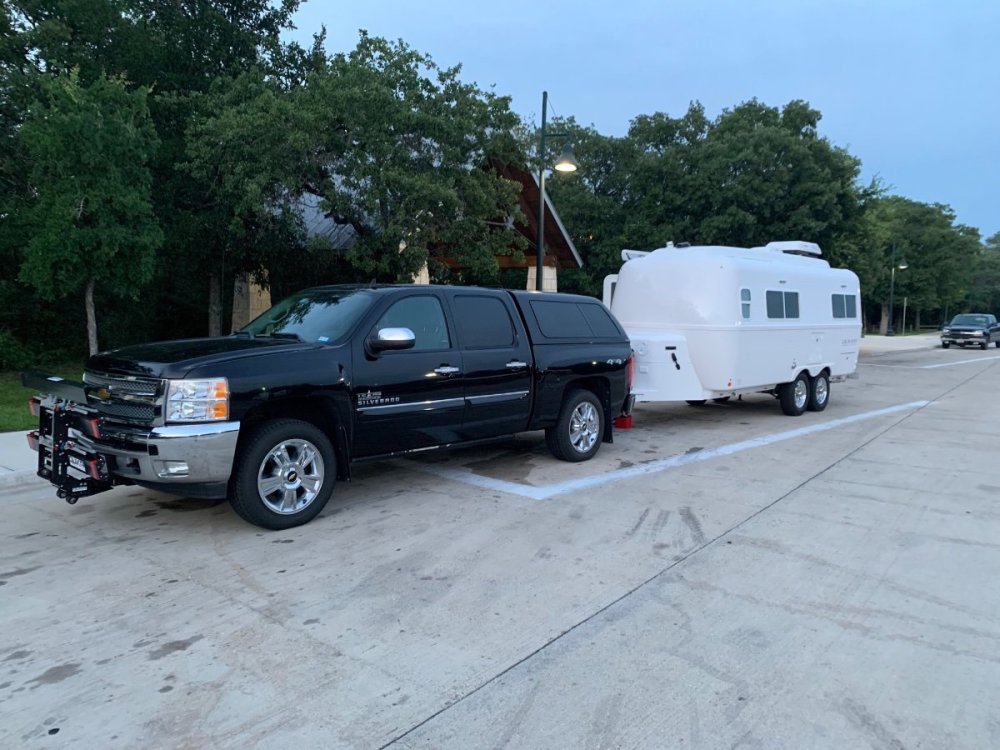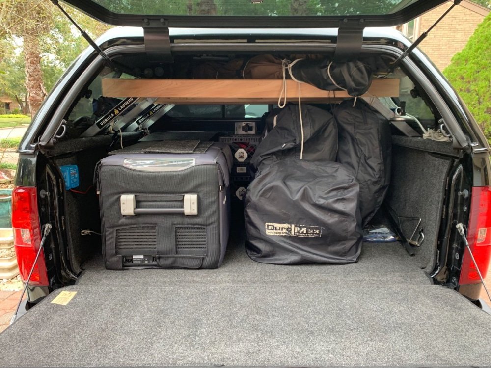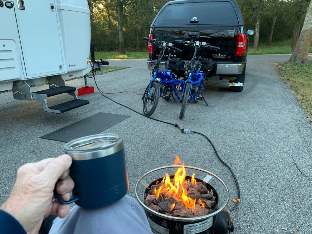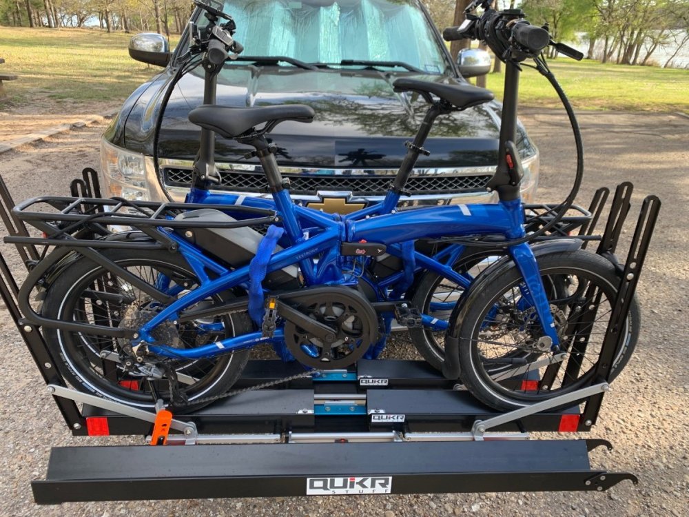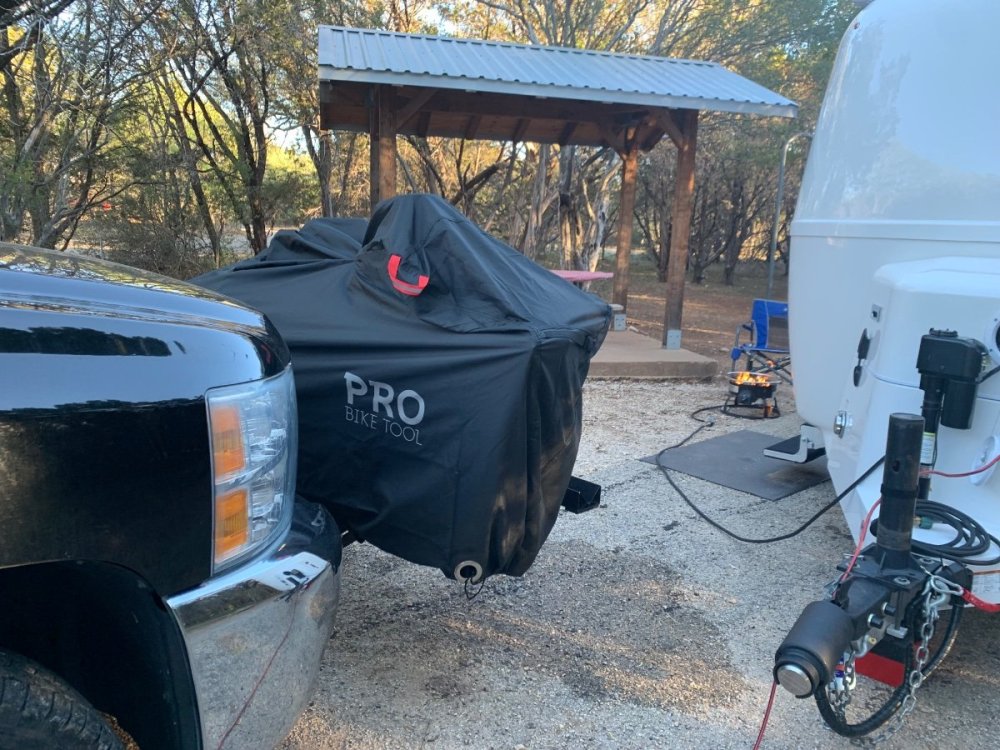 I solved our e-bike dilemma with a folding model and carry bag, easily transported in the TV under cap and staged on a front-mounted bike rack, as needed, when at camp. Bagged e-bikes shown behind the DuroMax generator. Front-mounted bike rack in use. Secure storage. Additional security and protection at night and/or inclement weather. Staged for day use. Easy transport to trails at distance from camp. Bike rack in travel mode.