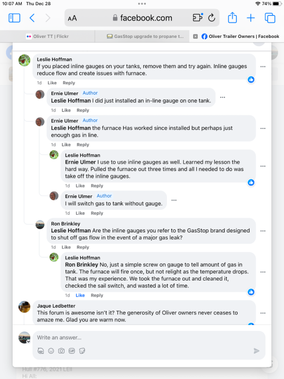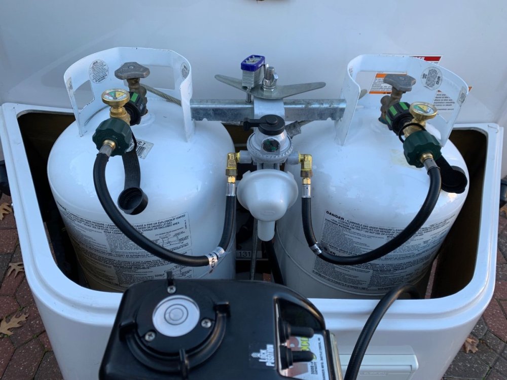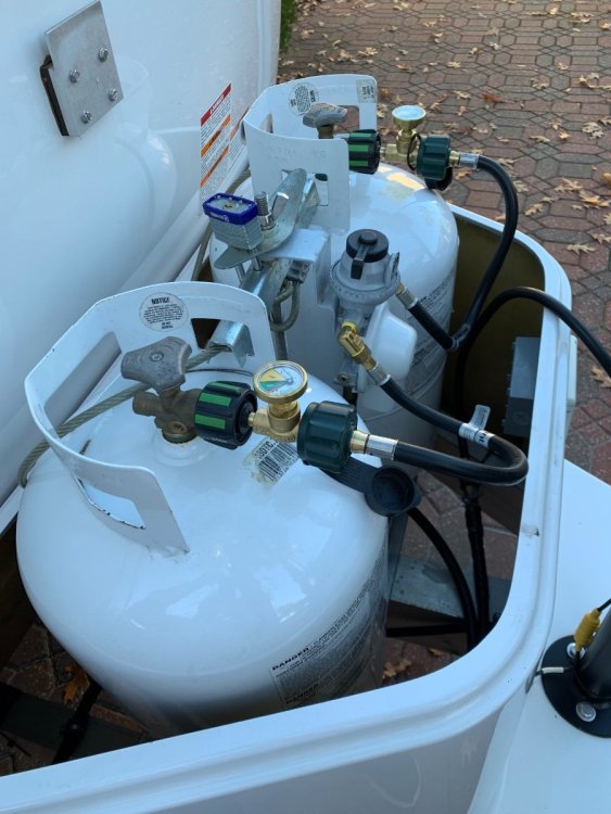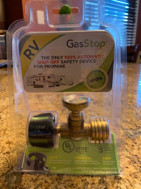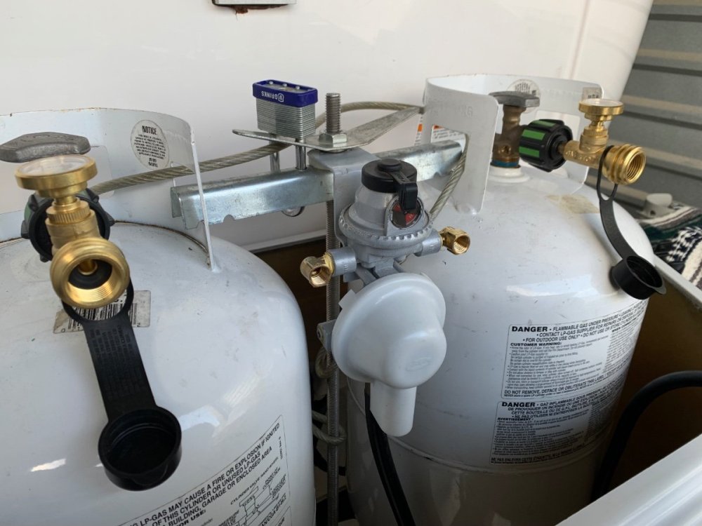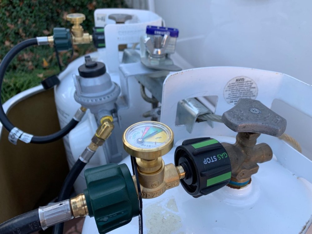 Yesterday I installed GasStop emergency shutoff devices to the Oliver’s onboard propane tanks. The process was very straightforward and relatively easy. However, did require a couple of longer pigtail propane tank connectors and additional fittings; the stock 12” pigtails were too short, given the added length to the tank valve assembly, and the ‘elbow’ fittings to lessen hose bend for improved fitment. Yellow thread sealing PTFE tape (gas-rated Teflon tape) was used, as necessary, in the installation; however, the pigtail connection is beveled and self-sealing, thus no tape necessary. The device: The pigtail: The fitting: Fittings to regulator: GasStop devices mounted: Pigtails mounted (Note the angle of the ‘elbow’ fittings were adjusted downward for best fitment): Gas level indicator/system prime: Another view (Note the cable and lock for theft deterrence): Once the installation was completed, a soapy water test was performed to check for minor leaks. With this device, the gauge also serves as a ‘primer’ by pumping it several times, as well as occasional pressure checks for leak detection. The system prime feature should benefit times when a tank is isolated for use with a generator, fire pit or grill/griddle to purge supply lines of air prior to initial use. Nuff said!