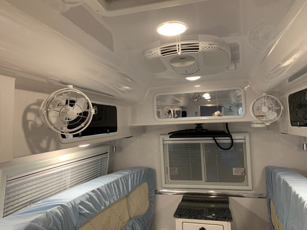 5. I agree, the Sirocco ll fans are tops! I did not want a permanent mount, so I used heavy duty Velcro to secure the fans (His and Hers) in optimum locations to maximize their use and be more obscure. One over each bed at the cabin rear and another curbside at mid-cabin (see pic) to better serve the galley and dinette areas, as needed. If you look closely, the white Velcro to secure the rear curbside fan is hardly noticeable. The fans are stowed in the attic when not in use or underway. I did alter the wiring to facilitate use of the 12v female lighter sockets of proximity. The rear street side fan cable loops through the cord hole servicing the TV to the socket in the attic, and for now the rear curbside is routed through the attic doorway until I make a hole to route it in similar fashion as the street side. I utilize the under counter socket above the cooktop for mid-cabin fan use. I installed DC 2.1x5.5mm female socket jacks and connected the fans’ stock power wire internally in each. I then altered two DC 2.1x5.5mm power plug extension cables by replacing the female end with a male lighter socket plug connector. This set up now allows for ‘plug and play’ versatility if I want to use the fans in my TV or an outdoor setting.