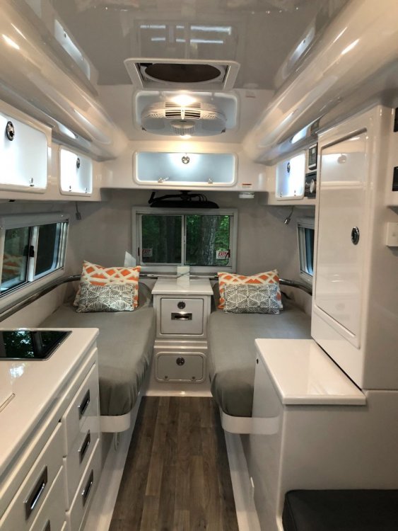Wow! The wood in your trailer is spectacularly beautiful. We also chose the white tops with the eventual plan to have Foy make us wood pieces. The black walnut looks great with the cushions and the flooring. We have the exact same interior as you. Congrats on your beautiful trailer and safe travels!
