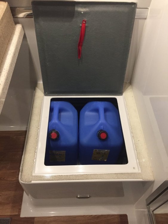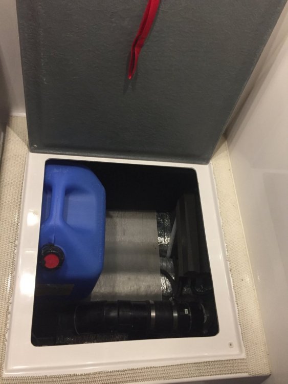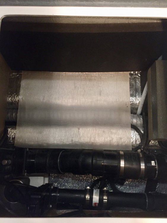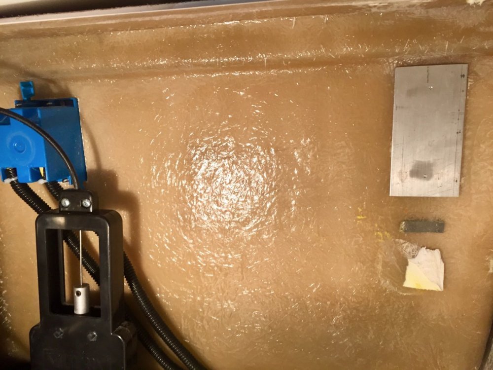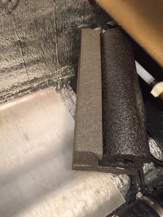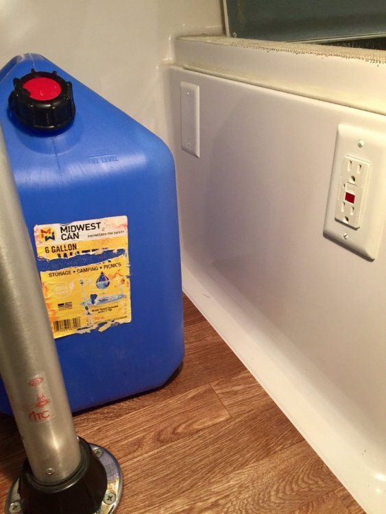 12. We prefer to bring our water from home which is filtered through ceramic filter. We use 6 gallon jugs to bring a supply of water with and then have smaller glass containers for our daily use, one is kept in the refrigerator for drinking water the other on the table for coffee or cooking. So to free up some space in the closet I decided to utilize the space under the dinette seating. To be able to accommodate two jugs I would drop the first one in the opening and slide it towards the foot well and then have the room in the opening to drop in the second one in. To accomplish this I had to remove the obstacle which was a receptacle box for the ground fault outlet. I relocated it to the opposite side on the same wall. By the way this was the first time that I cut any fiberglass on my trailer. It wasn't as bad as I thought it would be. I then made a aluminum backer plate so I could use a blank cover on the front to fill the hole that was left. My next concern was to protect the insulation on the floor of the compartment, so I decided to fit a piece of quarter inch plexiglass that I had on hand The last step of the project was to make a bookend to stop the water jugs from sliding forward. Here I used a short piece of 3/4" foam water pipe insulation and added some pieces of adhesive backed one inch foam to form the back stop, this is slipped over the black tank back flush pipe and butts up against the black water tank. There was one other obstacle, there were a series of wiring harnesses that came up out of the trough and were tethered with tie straps and screwed to the floor and then went off to various locations I had to undo the tie straps and gather enough slack to move the harnesses back far enough to clear the area where the plexiglass was laid. What am I going to do with all the extra space in the closet? Paul