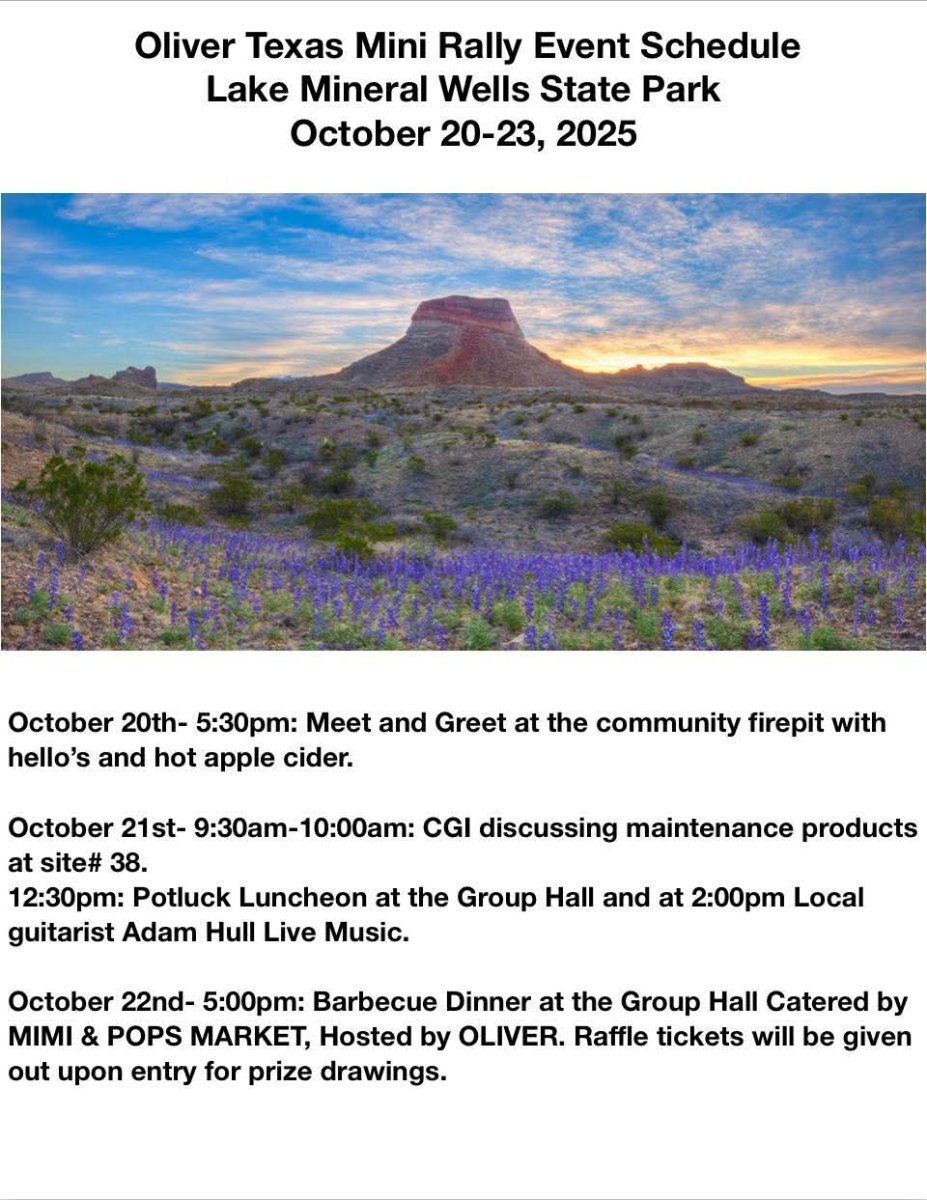 Paula will also be posting an itinerary closer to the event. Remember there will be a meet and greet at the firepit in the Live Oak Loop.