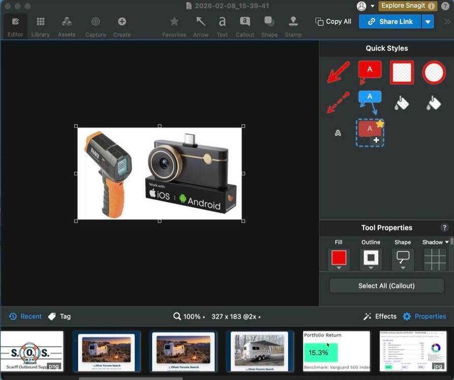 There are a good number of folks on these forums who love to share what they know, have discovered, and how they modified or fixed their rigs. This is awesome for new Oliver owners. They get to read the words and see detailed annotated pictures from the authors, dear I call them "Content Creators". As I approach retirement in December, there is at least one peace of software I now own personally that I have discovered from the work-place. I have created and edited hundreds of desktop video recordings for software demos and instructional videos in recent years. I use Camtasia from TechSmith for easy video editing, but another small piece of software they make, and is very inexpensive, is their SnagIt software. I will capture and edit pictures (and videos) from my desktop, browsers, or personal photos. This is what I use to very quickly annotate most of my uploaded pictures here in the forums. I'm hoping never touch MS Windows as long as I live, but SnagIt does work on both Windows and MacOS. I now mostly use MacOS as a "daily driver" OS, even though I'm a Linux lover at heart. Here's a screenshot of what SnagIt looks like. You can tell I've been doing all sorts of captures today, from my own future logo, to Olivers, and portfolio stuff. I thought this might be helpful to those who love to share their Oliver project pictures on their rigs. I won't link it here, just Google "SnagIt" - it's from TechSmith. I hope this helps others. If you have any questions, feel free to ask. Cheers,