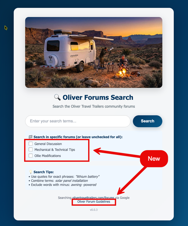 I've enjoyed working on this a bit more. Not sure how truly useful it is, but nice to have on my desktop to just pop open and search. This is what I've changed today: 1. Changed the color theme to match that of OTT. 2. Added check boxes to only search popular forums, such as "General Discussion". 3. Added a link at the bottom to always get a reminder of the forum Guidelines. 4. Page image(s) now come straight from OTT image library and cycles randomly with a page refresh. - There are only three images in the mix for now, so randomness is weak. Zip file attached containing only the single HTML file - nothing fancy. oliver-forum-search.zip -