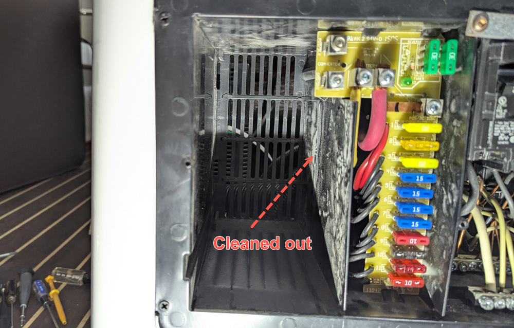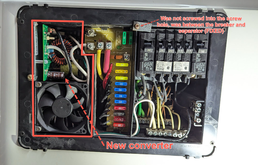 Well darn. I'm not sure if this is normal. I don't think it is. There seems to be a -2.3Amp draw on the system, even with every breaker off, EVERY 12v fused pulled out, and every resettable breaker popped open under the driver's side buck. Could this be the new converter/charger doing this? I need to wait for a cooler day to switch back to check. It's nasty hour in Georgia this morning. The only other thing changed was the battery configuration after tray clean-up. See battery diagrams, current -vs- orginal. That's the easiest to put back. There is NOTHING plugged into the trailer. No shore power, etc. Updated: I just ran through the troubleshooting instructions from Progressive Industries, everything checks out perfect and batteries are charging off of shore power, 120v/20a receptacle. https://www.progressivedyn.com/wp-content/uploads/2017/05/PD4045-TROUBLESHOOTING.pdf For my 2016 Ollie, the converter breaker is the 15amp breaker all the way to the right of the panel picture below. Thanks!