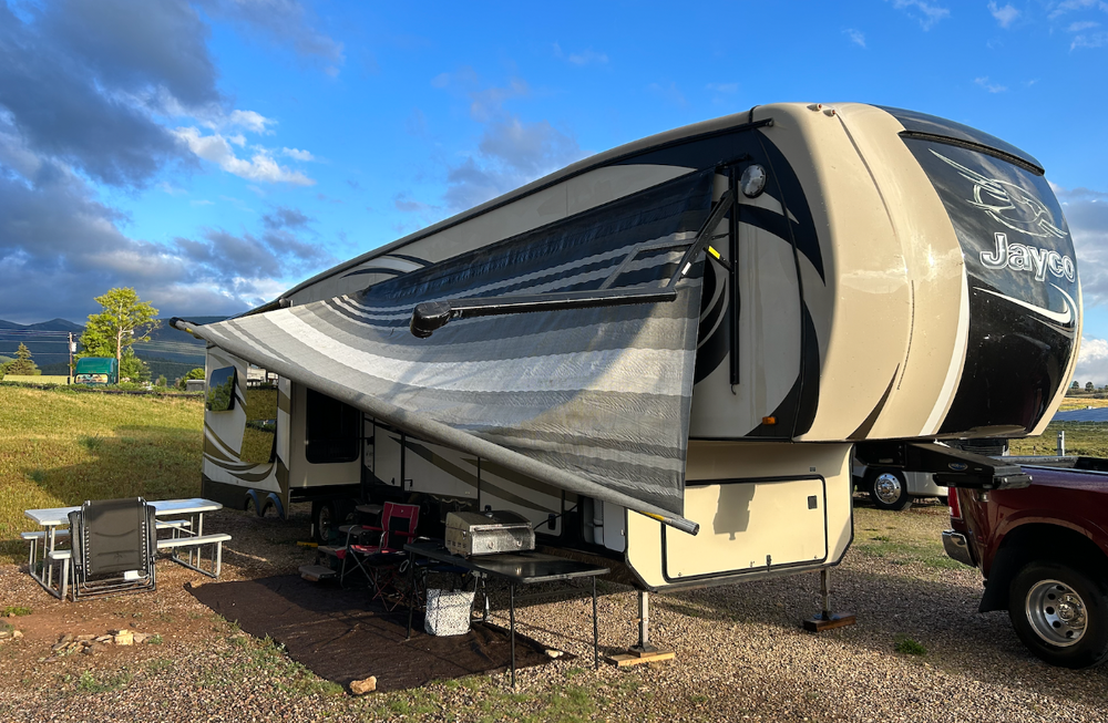 We were at Eagle Nest Lake SP near Red River last summer when we heard a major "CRASH!" in the middle of the night - sounded like somebody ran into our TV. Got up the next morning to find that the couple next to us did not retract their rather huge awning before turning in. A wind gust came up over the lake and took out the massive sun shade: Oops! Don't leave an extended awning unattended... -