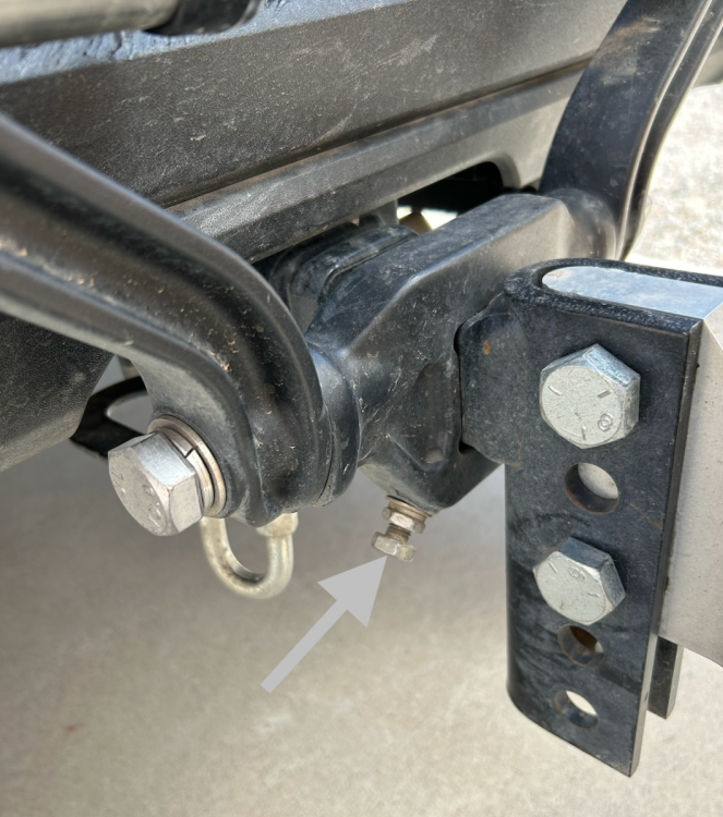 19. So there's two tightening bolts on either lower side of the mounting assy (the arrow's pointing to the STBD side bolt). The bolts are "double nutted" (w/washer and lock-washer) to the assy. which keeps it tight on the shank. The "looseness" we experience is the hitch shank/receiver connection when not towing. Once there's tongue weight on the system everything is "ROCK" (pun intended) solid - provided those 2 tightening bolts are torqued down. We've got a "Hitch Vice" in the shop with bent bolts from the AS days - once I get my hands on it, I'll take @topgun2's advice and fix it with a couple grade 8's...