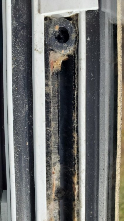 I took a wet paper towel and ran it along the track. That seemed to take care of the fuzzy look. I will keep the night shades up a couple inches as I had them completely closed before. I did check the drain holes and they're free of debris. Thanks for your comments. John