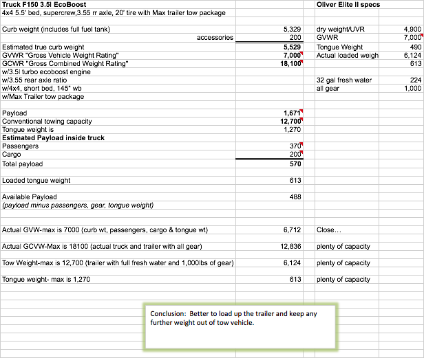 Towing an Ollie EII with F-150: I put this together (generally from an example somebody else posted) and then plugged in my particulars. Ultimately, I should be good when towing my Ollie. Interestingly, what I discovered was that I have plenty of towing capacity... but my payload capacity in the truck is going to be close... ok, but still close. -