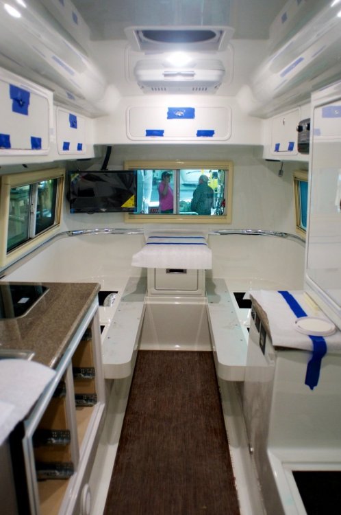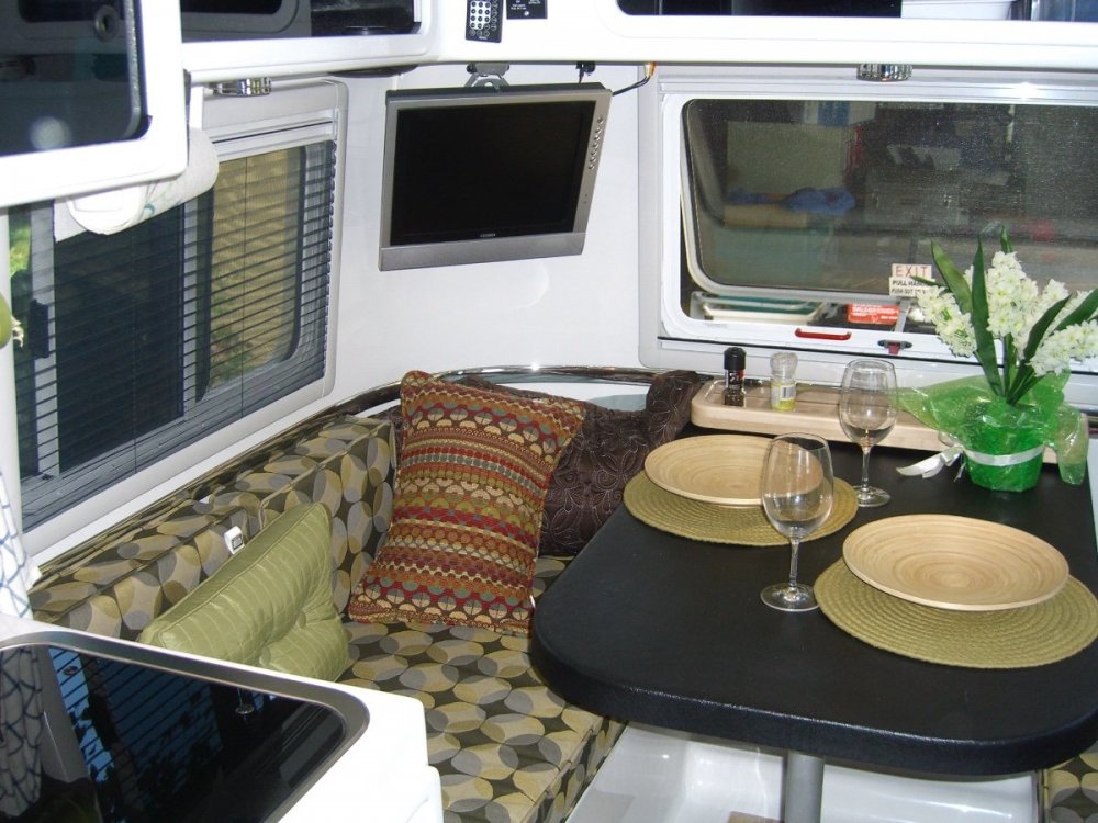 Looks great. The gutter is definitely a dirt magnet. I can't make out the knit rug in the back, but it sounds interesting. I'm curious how people deal with campsite dirt when you've got a big runner like that. We're constantly sweeping our trailer out - enough that I've thought about getting some sort of mat similar to our teak shower mat, so that dirt can just filter down and I can pretend that it's not there. We leave dirty hiking shoes outside, but just going in an out with camp shoes seems to bring way too much of the campsite in with us. So is it just us bringing all this dirt in the trailer, or do you guys vacuum, take the rug out and shake it off or what?