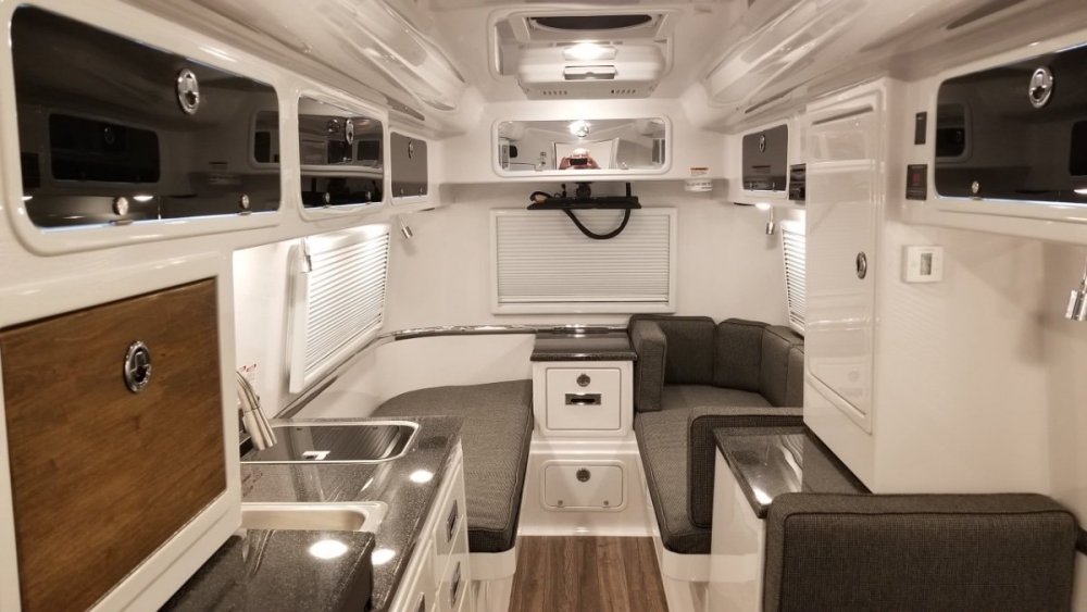 Here’s a photo of the original light grey, or putty: After that color was discontinued, Oliver switched to the off white, which was much complained about at the time. I think that the only other choice that Oliver had from their supplier at the time was black, or perhaps a dark bronze color. This photo is from the factory, so you can see that they had that ‘yellowed’ look from day one: Around mid-2017, Oliver was able to get a pure white version that matches the interior fiberglass, and that’s what they still use today: