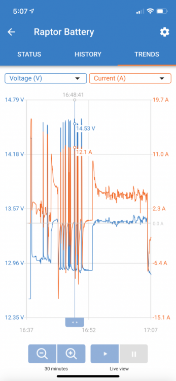 Exactly. Here’s a chart from a 30 minute trip I just made. This is from the battery monitor on an AGM house battery that I have under the back seat of my truck. It’s connected to the starter battery with 2 awg cables and a Victron Cyrix smart relay. I have a 12 volt fridge attached to the house battery, which is the amperage load that you see on the chart. I had auto start/stop disengaged. In this case, I had just made another short highway trip that had already fully charged my start battery, so you don’t see a prolonged period at 14.6+ volts are the start. The house battery was at about 85%. You can see that the voltage goes into the 14’s for just a brief period before settling in at 12.8 or so. The spikes at the beginning of the drive are in stop-go traffic. (The truck has electric assist on the brakes so those are the spikes.) You’ll see that it evens out for a bit once I get in the highway, but then jumps suddenly to around 13.4 volts. That’s when I turned on my headlights. (BTW, that’s been a GM owners trick for a while to get their voltage up to a charging level.) So you can see that modern electrical systems only provide the voltage that the truck needs at any given time. They do this regardless of what other load you add to the system. Unfortunately, while I may be able to trick the system into providing 13.4 volts, that isn’t enough to charge lithiums, since I’d probably only see 13.2 or less at the battery. So yes, a B2B charger is absolutely needed.