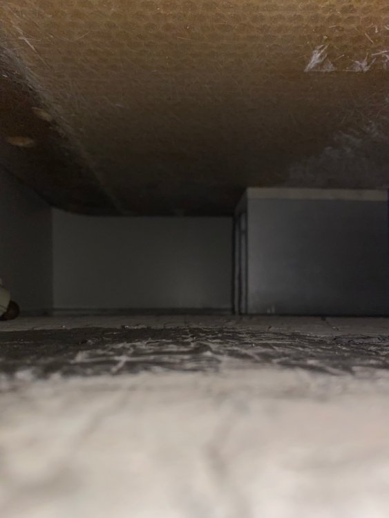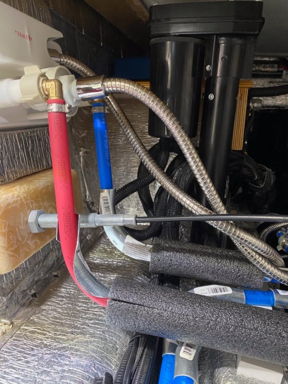 I do plan to make a separate topic for my plumbing mods, including the separate shower and new bath sink. Soon...ish. But here's some photos of the under floor area. I ran my plumbing right behind the grey tank and tied them to the top of the valve, using it as a ramp to drain the lines the way I wanted. There's actually more space behind the blocks, as you can see. I ran some flex duct through there just to see and there's plenty of room behind the valve to slip it through, as you can see on the pic from the other side. Also in that pic, you can see the 4 plumbing lines coming through. The two on the top are for the outside shower, but you can see the check valves on the two incoming lines underneath. I made a small block to fit the top of the drain and used that to air the lines down. I've since insulated the rest of the lines.
