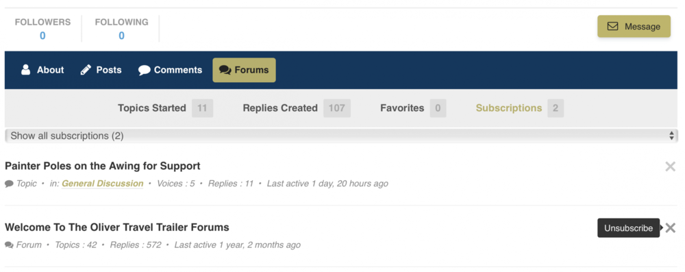 Landrover, I just took a look at your profile and it looks like you are subscribed to the entire "Welcome To The Oliver Travel Trailers" forum. This may be intentional, or as I said earlier, could easily have been a slip of the thumb while scrolling through the forum on a phone. That's an easy forum to get subscribed to and not realize it, since it gets relatively little traffic and you could go for some time before receiving any notifications. We did in fact have quite a few spam posts in that forum yesterday, and so you would have received a separate email for each post. You can follow the instructions above to delete that subscription, or if you'd like, one of the moderators can do that for you. If you'd like to keep the subscription, just understand that if more spam gets posted to that forum, you will get another email.