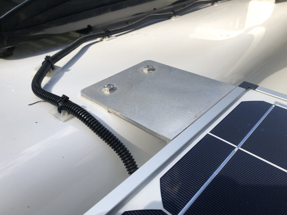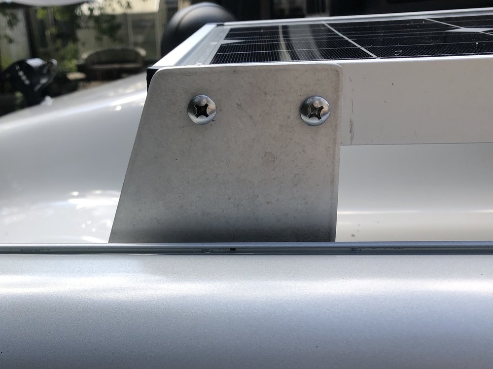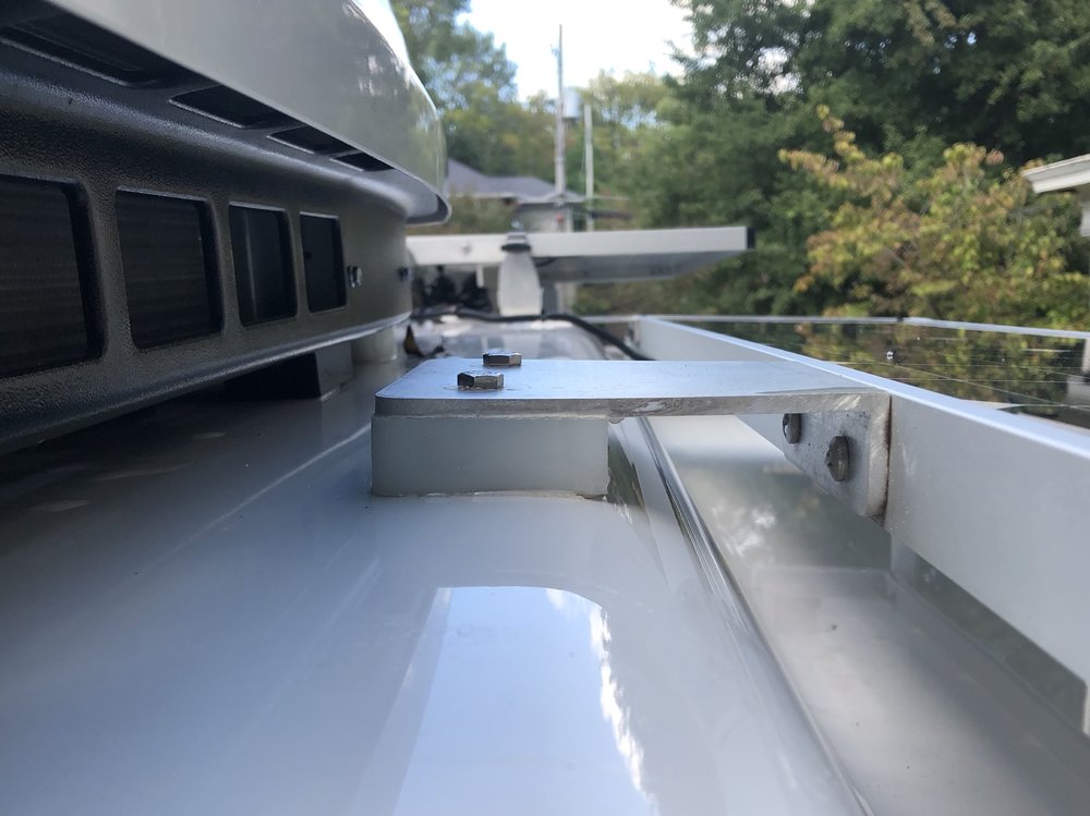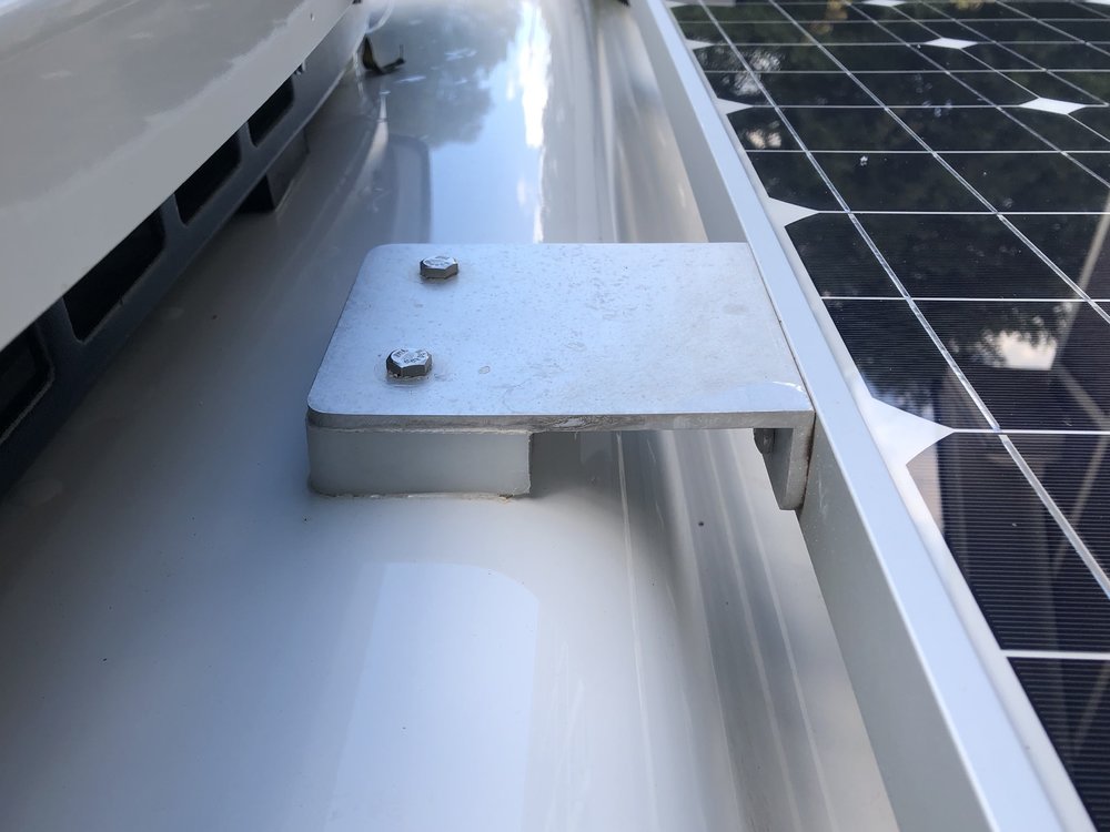 Mike, I have awnings on both sides so they mount the same. Oliver did the mounts for me and I’ll post some photos below. You might call service and see if they’d do the same for you. Not sure about mounting them at an angle since what you gain one side you’d lose on the other so it would probably be a wash at best. Some of the Ollie solar pioneers mounted their larger panels at an angle like you’re talking about so you might search some of the early posts for photos. It would be nice to somehow hinge them or attach them with pins so that they can be removed for cleaning. Though as mine are, I can clean under them though it’s a bit of a bother. The A/C is the only thing to worry about shading the panels but that’s late in the day when you aren’t getting much solar anyway and shading those panels won’t affect the others.