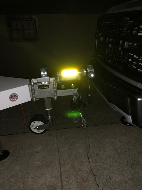 19. You might want to put a strip up high on the rear. I've learned from experience that traveling down a muddy gravel road will completely cover your rear end with mud, due to a considerable low pressure area behind the trailer. I've had it so bad that even the marker lights up top were covered. I placed a few red/white strips on back of my rear solar panels, but a strip on the AC housing or above the 'Oliver' would work, so long as it doesn't angle upward any. I think you'll find that the flat strip on the front of your trailer won't be of much use, since you have to be about 90° to the tape, both you and the light source, for it to reflect. The cross strip should work, though. Test it with your rear view camera, though. Those cameras don't have a ton of range and a strong light source could make them darken the image so much that you can't see the hitch. Here's some tape I put onto my hitch for the same reason. Looks amazing in a photo, but in real life does nothing -