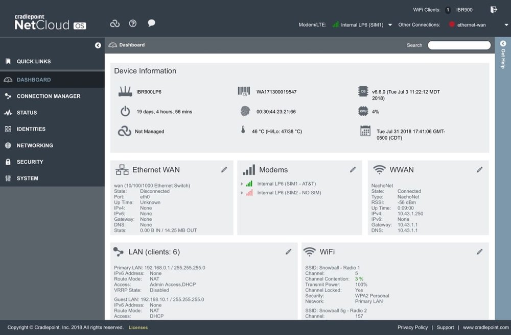 The model I have is the IBR900. I have their 5 in 1 antenna, which has 2 cell antennas, 2 wifi and a GPS antenna. The router itself comes with antennas, and in retrospect, I probably should have tried using them first before paying extra for an external antenna. And, even with an external antenna, it probably would have been wiser to get their 3 in 1, which just has 1 each of the cell and wifi antennas, and use the included antennas for the other two. In fact, I might try unhooking one of the external wifi antennas and use the included one instead, just because it probably makes more sense to have one inside the trailer. Not that we've had any connection problems. Here's where I've mounted the router and antenna: Mounting the antenna was scary since I had to drill through the roof, but actually very easy to do. I think it was a ½" hole through which you stick the cables and a threaded rod and then secure it from inside the attic. I think the bottom of the antenna had 3M tape also. Easy. I caulked it both at the hole and the perimeter, and I think it will be fine. Since I don't have a stereo, I used that circuit to power the router. In addition to wifi, it has two ethernet ports on the back, which came in handy for me as I could connect it directly to my Victron control panel for a full time internet connection. I added an ethernet switch to the other port just because I had one lying around so why not. I don't know what I'd use it for though. I'd say that the initial setup is actually pretty easy. Just insert your sim, plug it in and then connect to it via your phone or tablet. Then it asks you to change the wifi name and password and maybe a few other things and then you're good to go. Like a cable router that you might have at home, you can connect to the Cradlepoint in your browser by entering its IP address and it gives you an administrator page through which you can adjust any settings: What makes it less user friendly is doing things like connecting to an outside wifi for internet, which isn't intuitive in the least. So unintuitive, in fact, that I actually had no idea that it was even a feature until I ran across "WiFi as WAN" in the manual and wondered what on earth that meant.