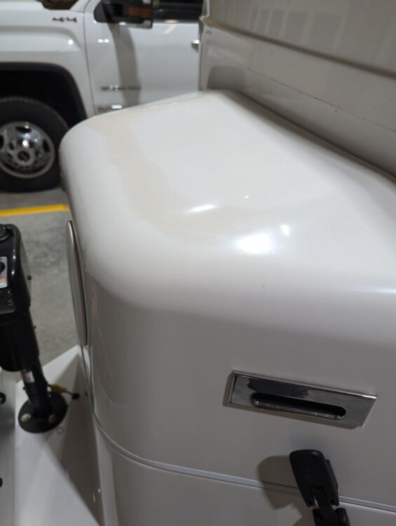 I'm seeing a yellowish discoloration in a band around the top of our propane cover. Hard to describe, but it looks like the white pigment in the gelcoat is wearing off, leaving this one area slightly yellowish, but still very smooth. The trailer has been washed after each trip, kept waxed, and garaged when not in use. Haven't seen this on any other part of the hull. Tried a bit of wax on this area, but it didn't change. Any ideas?
