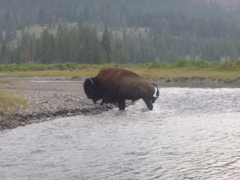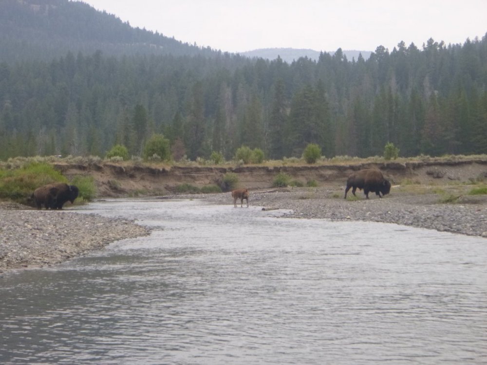 Indeed, bison can be both fishermen and gentlemen. This guy decided he wanted to cross right in front of where I was fishing and then he came back to "help" Mom and child across? Then, later, a buddy of his was sleeping on the bank. I didn't see this last guy as I was getting out of the stream, but, his snores were loud enough to wake the dead. Unfortunately, I didn't capture the little clouds of dust that came off the ground as he exhaled!