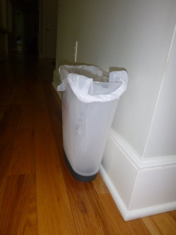 After 4 and a half years of using a re-purposed paper shredder bucket for a trashcan in my LEII I finally found a reasonable replacement. While the shredder bucket did the job of holding regular plastic bags as liners and was small enough to fit on the floor under the pantry without sticking out too far into the aisle, it certainly wasn't very stylish. While running errands after a doctors appointment in the big city of Asheville, NC today my wife and I stopped into a Big Lots store where I found this (see pics below): The dimensions are approximately 12.5 x 12.5 x 6.25 inches. It can be found at: https://www.biglots.com/product/clear-slim-2-4-gallon-wastebasket-with-flat-gray-base/p810428520 I did check Amazon when we got home and they only sell these in sets of 6 and even then they are $5 each and WalMart wants $10.32 for exactly the same thing. Bill