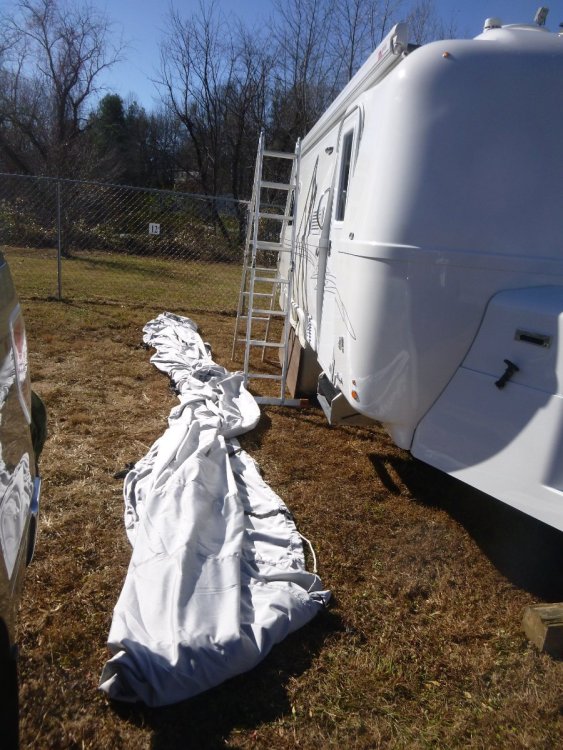 OK - assuming the lighter one: 1. as dewdev points out above, cover/pad all sharp edges. The solar panels are the biggest and next would be the bumper. Pool noodles are your friend for both of these. 1a. don't forget to remove the antenna of the rearview camera if you have one. 2. lay out the cover on the ground with the front of the cover at the front of the Ollie and the back at the back. 3. Either get up on a ladder or use "painter's poles" with tennis balls on the ends to protect the cover (thanks to Patriot for this "painter pole idea) to feed the cover onto the roof and over obstacles that are on the roof. Adjust the cover using the poles or while on the ladder both front to back and side to side. 4. Batten down the hatches. 5. Grab a adult beverage an admire your work. Bill