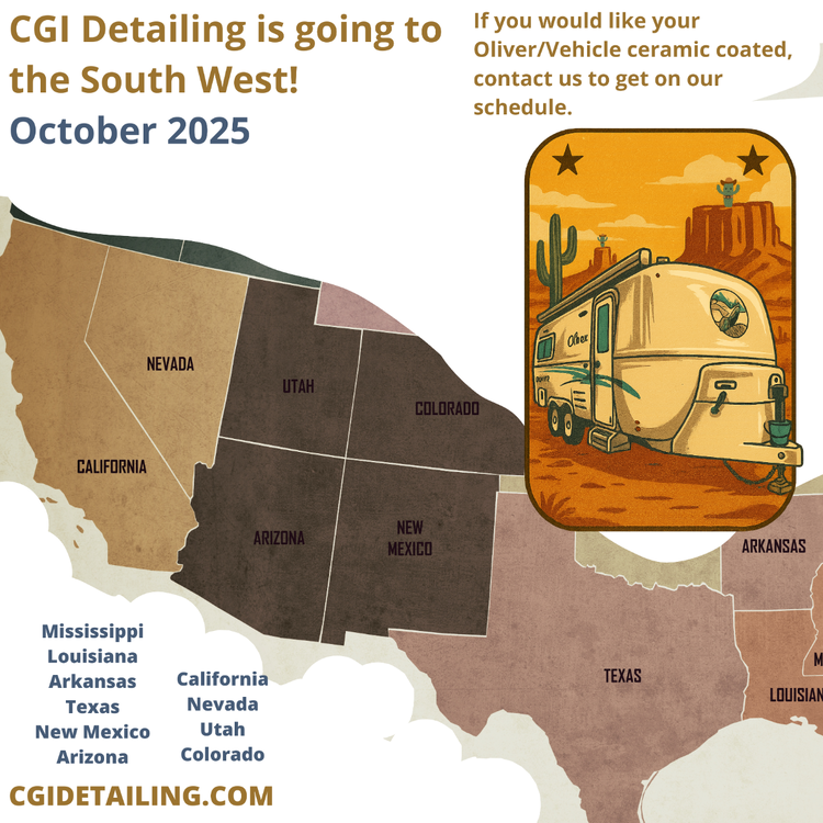 CGI Detailing will be in Texas late march to early April. We will be staying for the solar Eclipse as well! If you are interested in getting your Oliver restored to like new condition and ceramic coated please reach out to us. https://www.cgidetailing.com/contact-us or you may give us a call! (615) 900-0648 A little information on how we plan our trips out: When planning our trips we get a group of people interested in getting their Oliver ceramic coated and we plan out the entire trip splitting the travel fee evenly amongst everyone to make it cheaper per person. With the being said, the more people that sign up, the cheaper the travel fee will be! often times it's cheaper to have us come to you that it is to come to us! Just so you don't have to go looking for the information about what we charge for ceramic coatings I'll give it to you here. We include 2 steps of correction and light oxidation removal into the starting price, this also includes everything else that like washing, and prepping the whole trailer for ceramic coating. If there is heavy oxidation on the surface that needs to be removed we do charge an extra $400 per step we take beyond the 2 that are included. We often times will only need to use 2 steps of correction though. We start at $3,000 for the LE2 and $2,500 for the LE1. here is a link to one of our YouTube videos going of the recoat of a 2 year old ceramic coating: