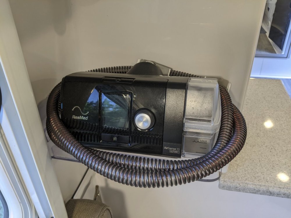 The CPAP machine isn't very heavy, probably only 2-3 lbs but the shelf could support quite a bit more weight. I do leave the shelf attached and so far it's stayed put. I like the idea of an outside beer shelf! 😃 I chose polycarbonate over acrylic plexiglass because it is much stronger and won't crack. However, using polycarbonate did offer a few unique challenges that I hadn't anticipated... My original design had a curved ledge running all around the shelf which I had planned to heat and bend around the shelf. I've done similar bends with acrylic without much problem. I researched bending polycarbonate and the suggestion for doing so at home was to heat the piece you intend to bend in an oven: https://www.justpolycarbonate.com/post/bending-polycarbonate-everything-you-need-to-know When I went to actually do it, I quickly learned that heating and bending polycarbonate is much trickier then bending acrylic. Polycarbonate has to be heated to a much higher temperature (around 400 F). You have to watch it closely because if you heat it for even 30 seconds after it becomes flexible, it transforms into an almost unrecognizable opaque white material! (see photo). Even when you catch it at the perfect time, you only have a few seconds to bend the material before it hardens up again. After a few failed attempts, I gave up and redesigned the shelf with straight ledges! I bought a 12"x24"x1/4" sheet of polycarbonate on Amazon but if you live close to a plastics dealer such as TAP Plastics, you can often find remnant pieces in their bargain bins. Polycarbonate (and acrylic) are typically solvent welded when attaching pieces together. This was the product I used: https://www.amazon.com/gp/product/B003HNFLMY/ref=ppx_yo_dt_b_asin_title_o03_s00?ie=UTF8&psc=1